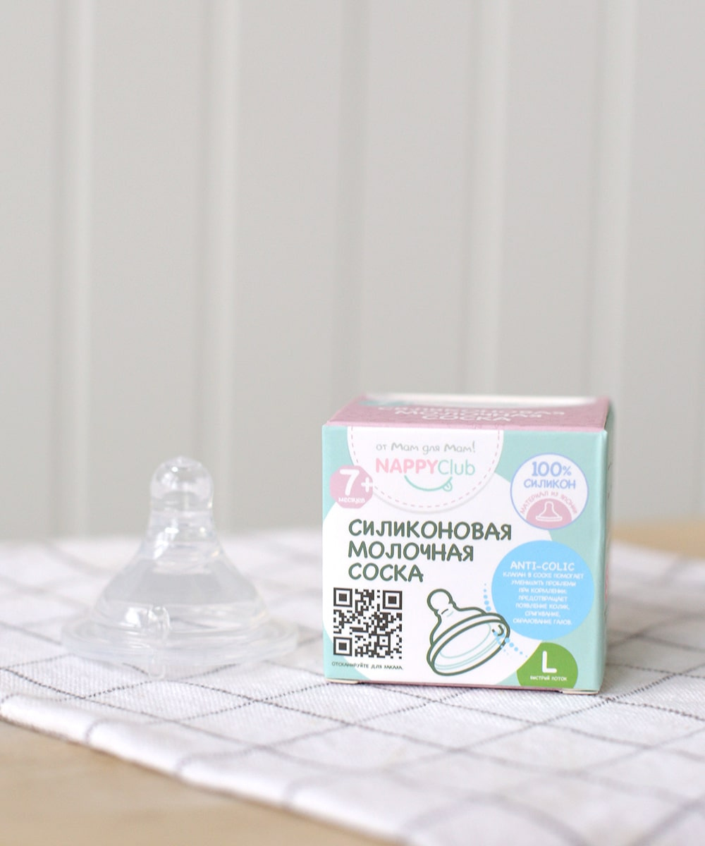 Соска подойдёт для всех бутылочек NappyClub, кроме силиконовой бутылочки.