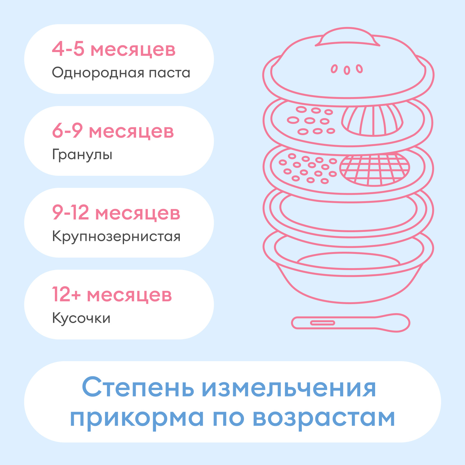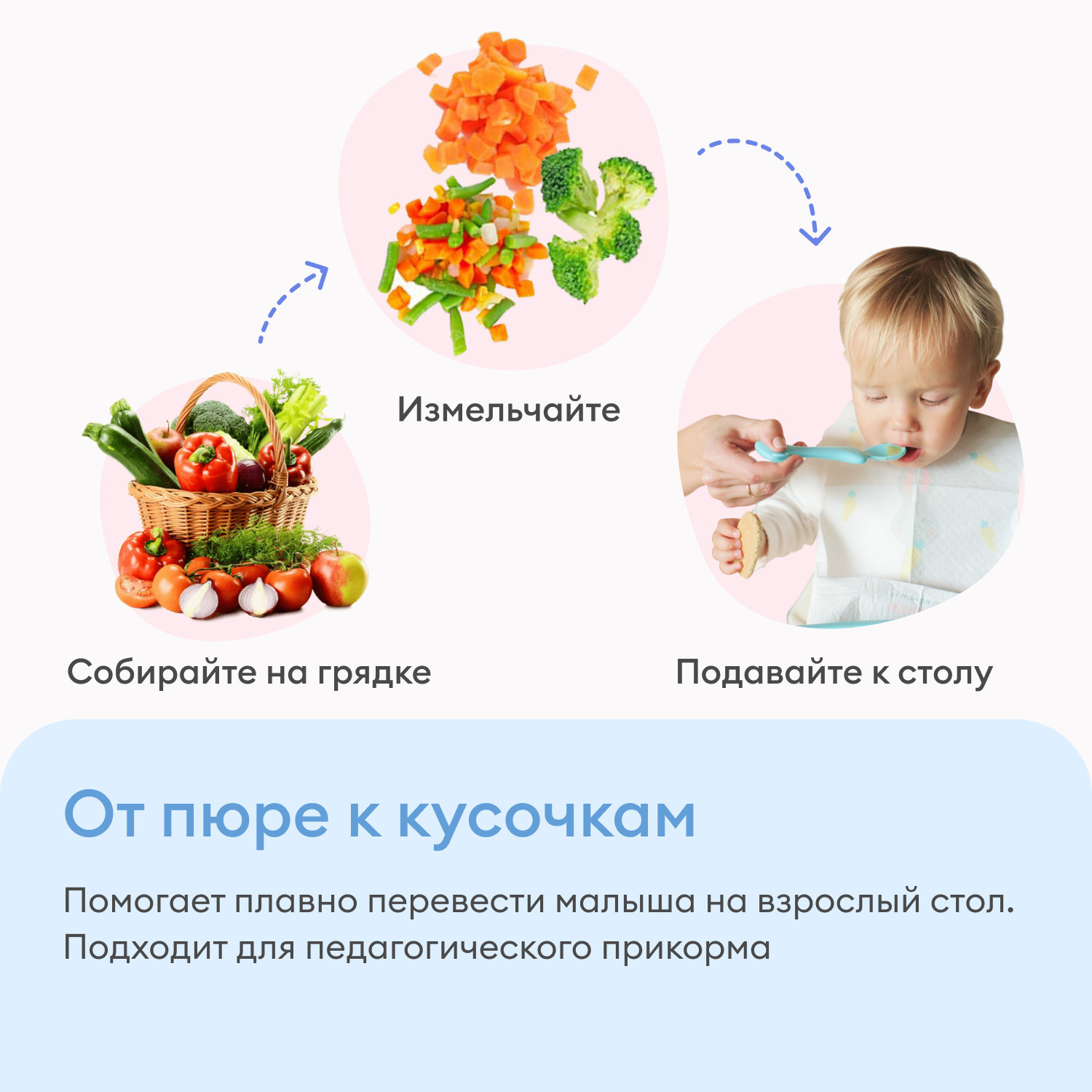 Если ваш малыш проявляет интерес к еде из вашей тарелки, но пока не готов в полной мере к взрослой еде, это устройство станет для вас незаменимым помощником. С помощью крышек с теркой и ситом вы легко сможете измельчить кашу, овощи, ягоды и фрукты в безопасные для ребенка кусочки. Малыш будет знакомиться с новыми для себя вкусами, а вы будете спокойны, что он не подавится.