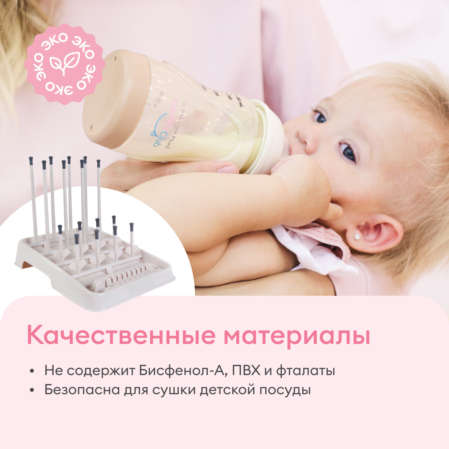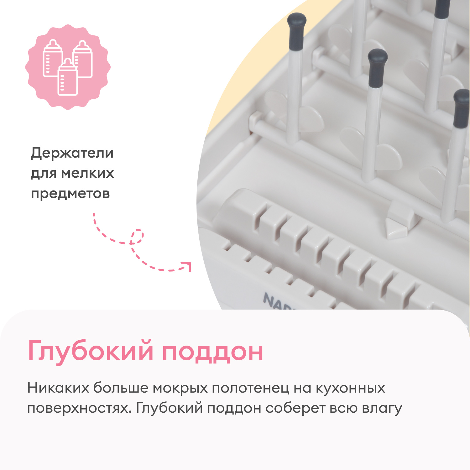 Подставка для сушки бутылочек изготовлена из высококачественных и безопасных материалов, которые не выделяют вредные вещества. Детские приборы сушатся отдельно от взрослой посуды, что позволяет поддерживать их чистоту и стерильность. Глубокий поддон собирает всю скопившуюся воду. Никаких больше влажных полотенец на кухонных поверхностях, представляющих питательную среду для болезнетворных микроорганизмов.