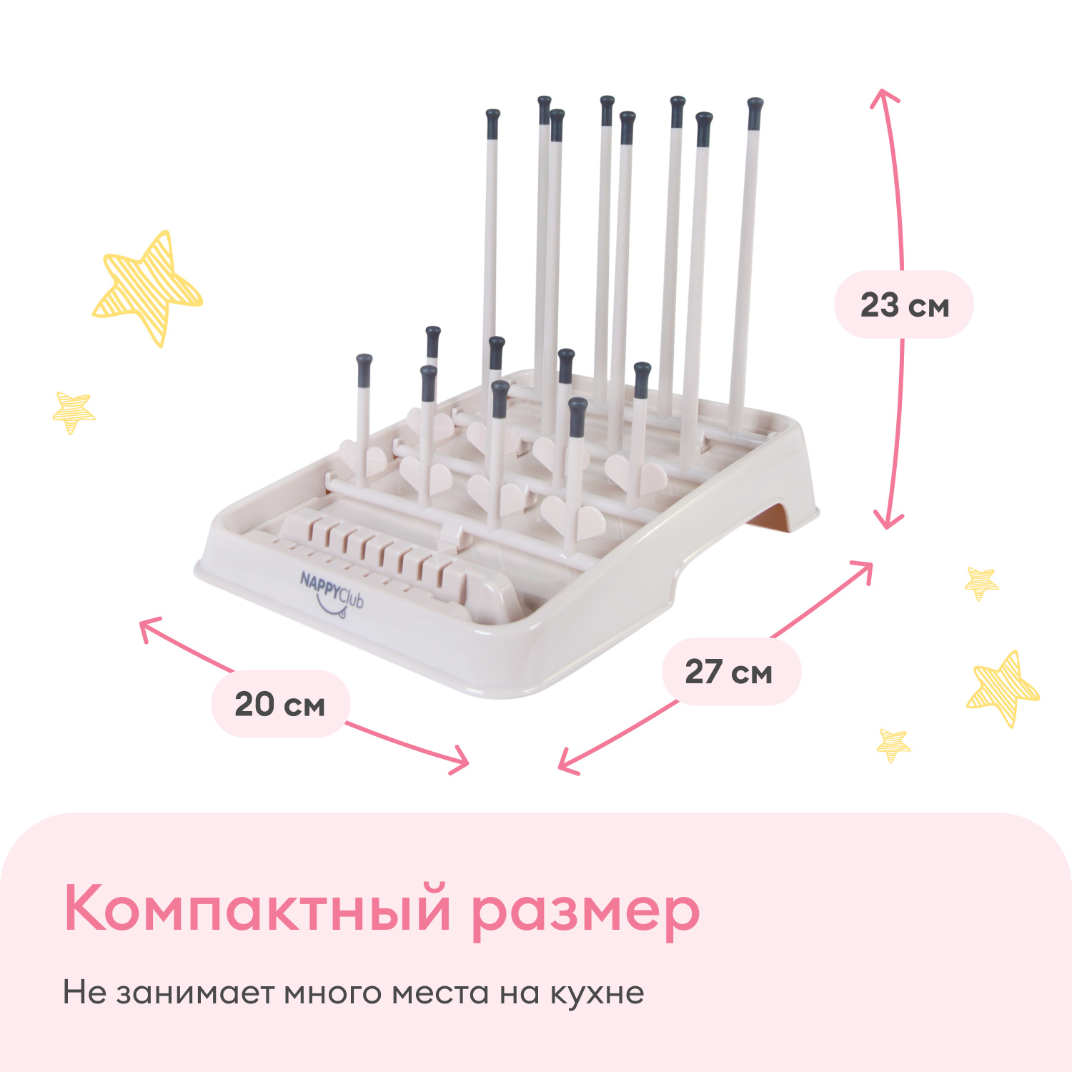 Стильный дизайн подставки для сушки бутылок позволяет разместить ее на любой современной кухне, нейтральный серо-бежевый цвет впишется в интерьер и не будет создавать визуального шума. Сушилка отлично смотрится в паре со Стерилизатором для бутылок в СВЧ от NappyClub.