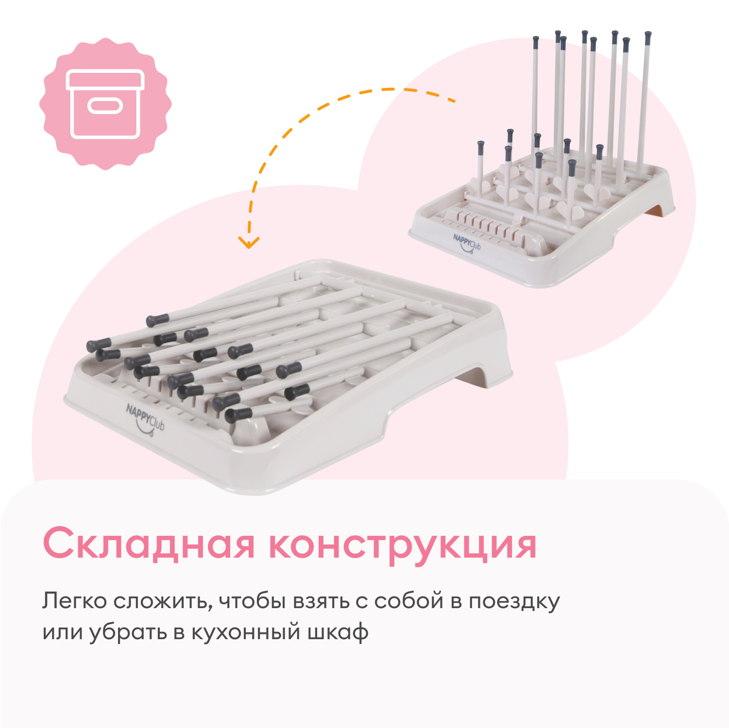 Сушка для бутылок удобно складывается и занимает мало места. Ее удобно хранить и транспортировать, можно взять с собой в поездку, за город, на дачу. Сушилка легко складывается для удобного хранения и удобна для путешествий. Чтобы убрать сушилку, вам просто нужно сложить стойки лицевой стороной вниз. Храните в чистом и сухом месте. Перед хранением убедитесь, что продукт полностью высох.