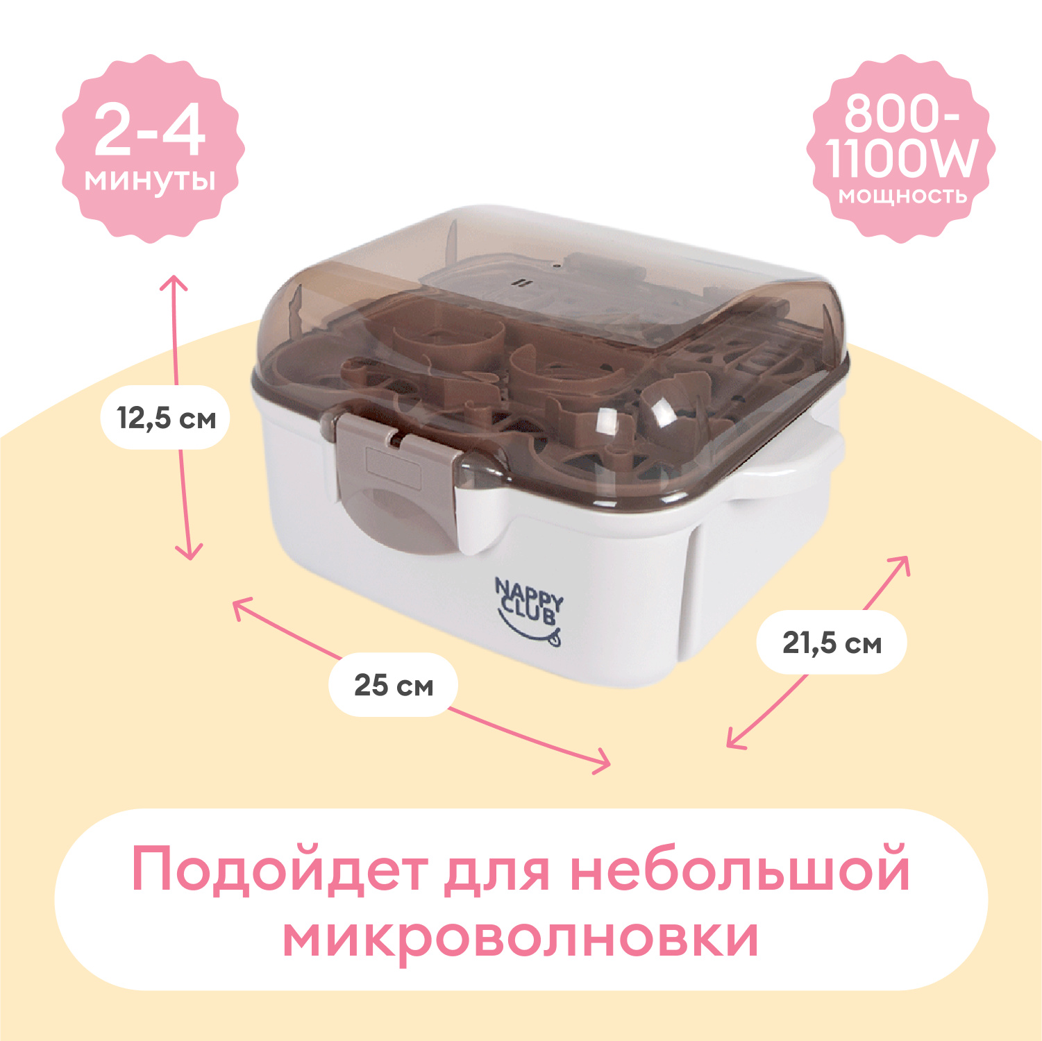 Лёгкий и компактный стерилизатор подходит для большинства микроволновых печей. Не занимает много места на кухне. Подойдет для небольшой квартиры. Легко хранить и переносить.