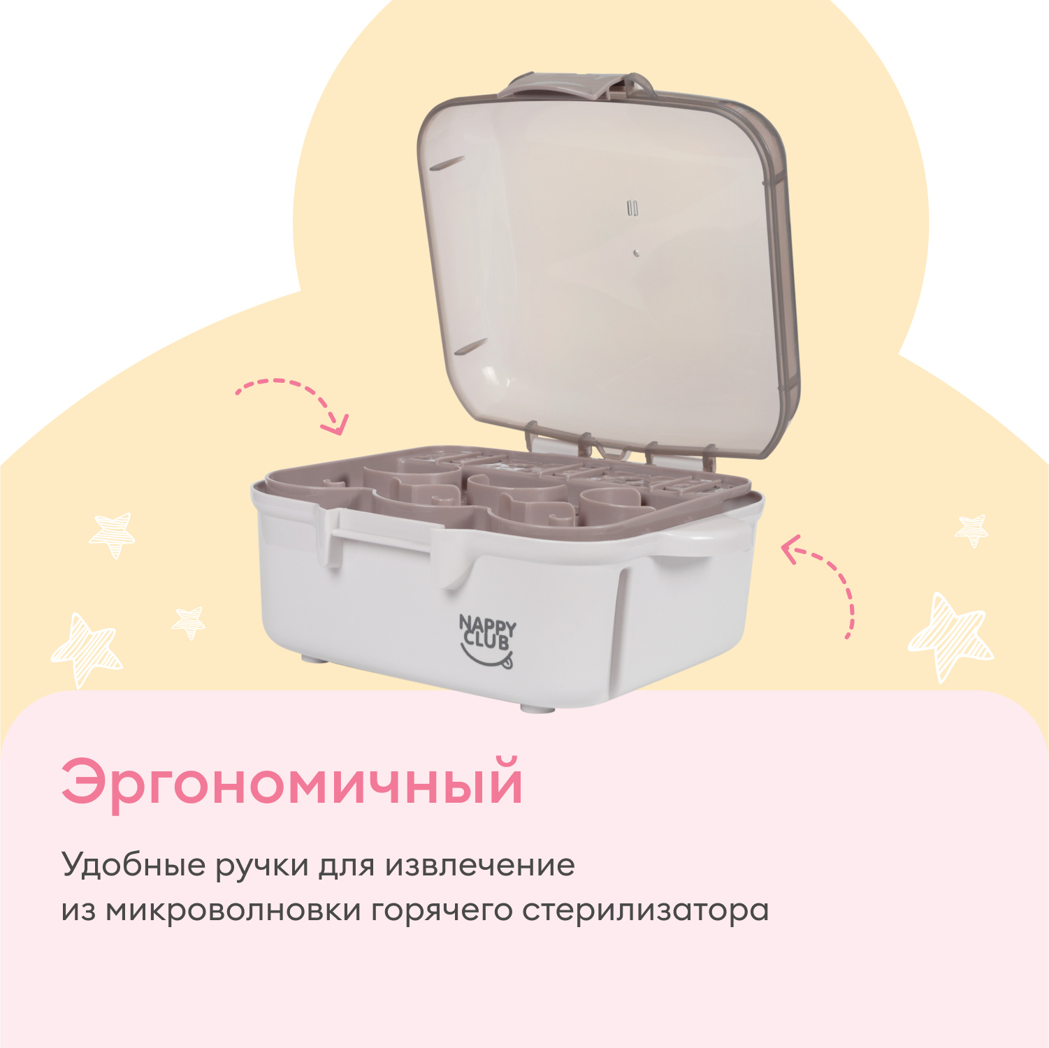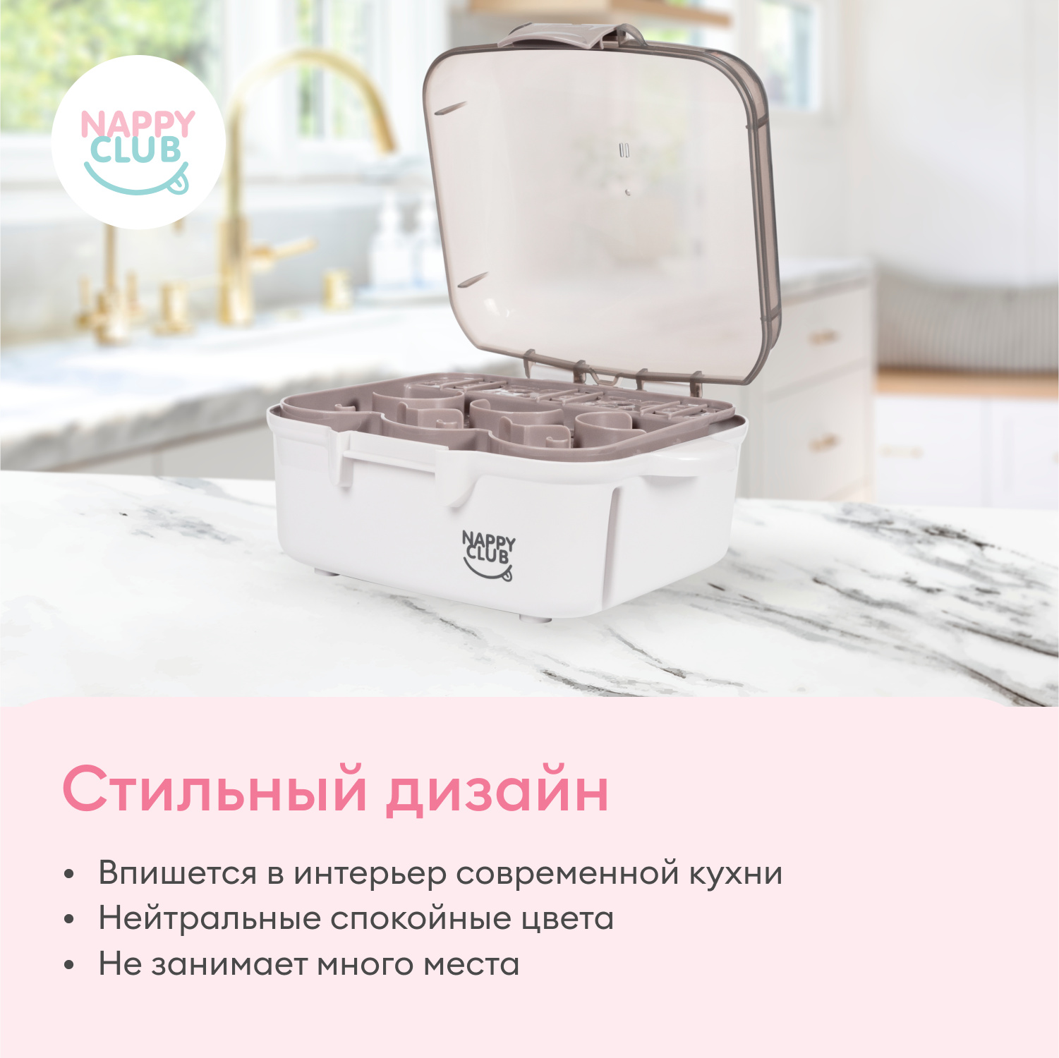 Минималистичный стильный дизайн стерилизатора позволяет разместить его на любой современной кухне. Нейтральный серо-бежевый цвет впишется в интерьер и не будет создавать визуального шума. Стерилизатор отлично смотрится в паре с Сушилкой для бутылок и сосок NappyClub.