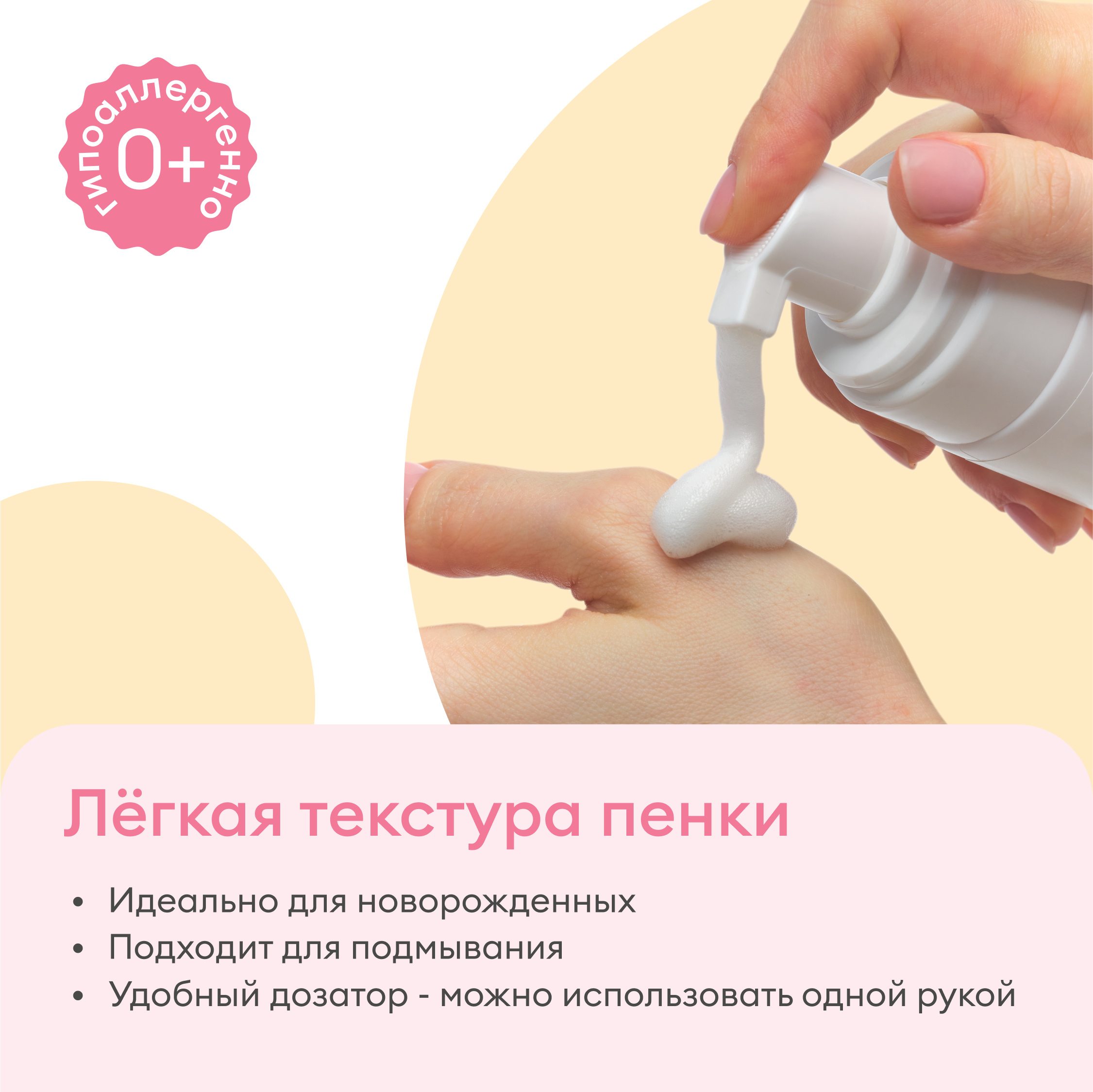Идеальна для новорожденных - легкая текстура пенки не сушит и не вызывает раздражения, увлажняет и питает волосики и кожу малыша.