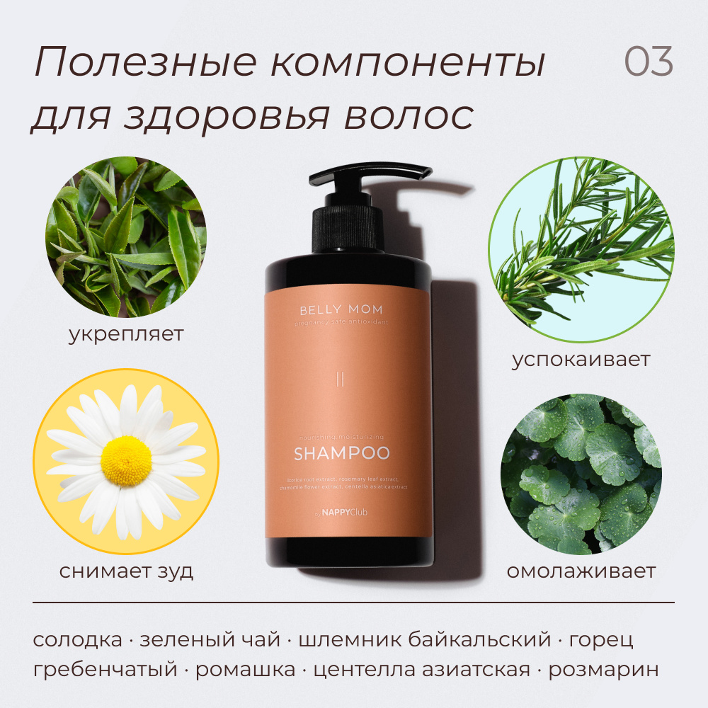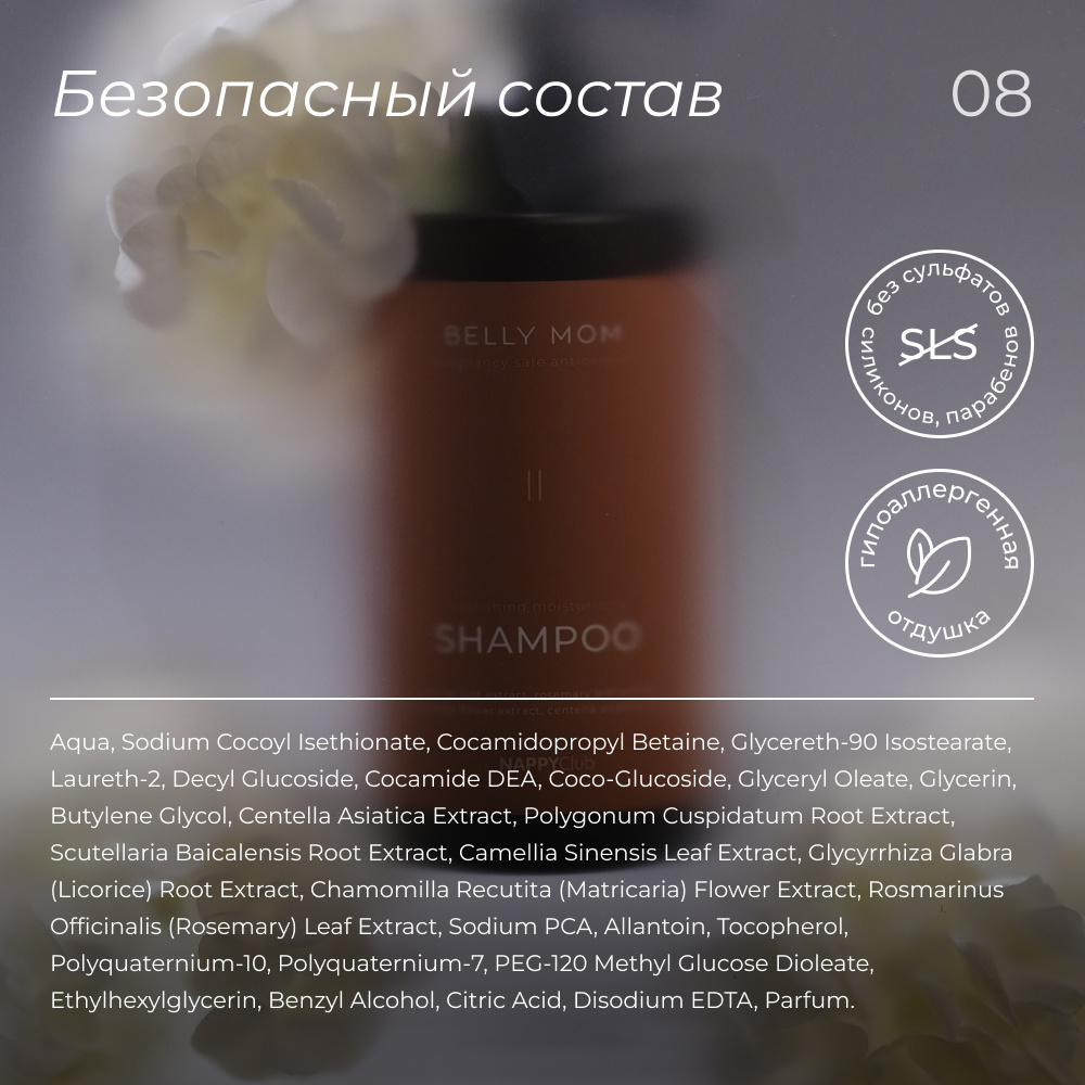 Антиоксидантный бессульфатный шампунь BELLY MOM разработан для будущих мам, чтобы поддержать красоту волос. Сохраняет защитный барьер волос и кожи головы, успокаивает и предотвращает воспаления.