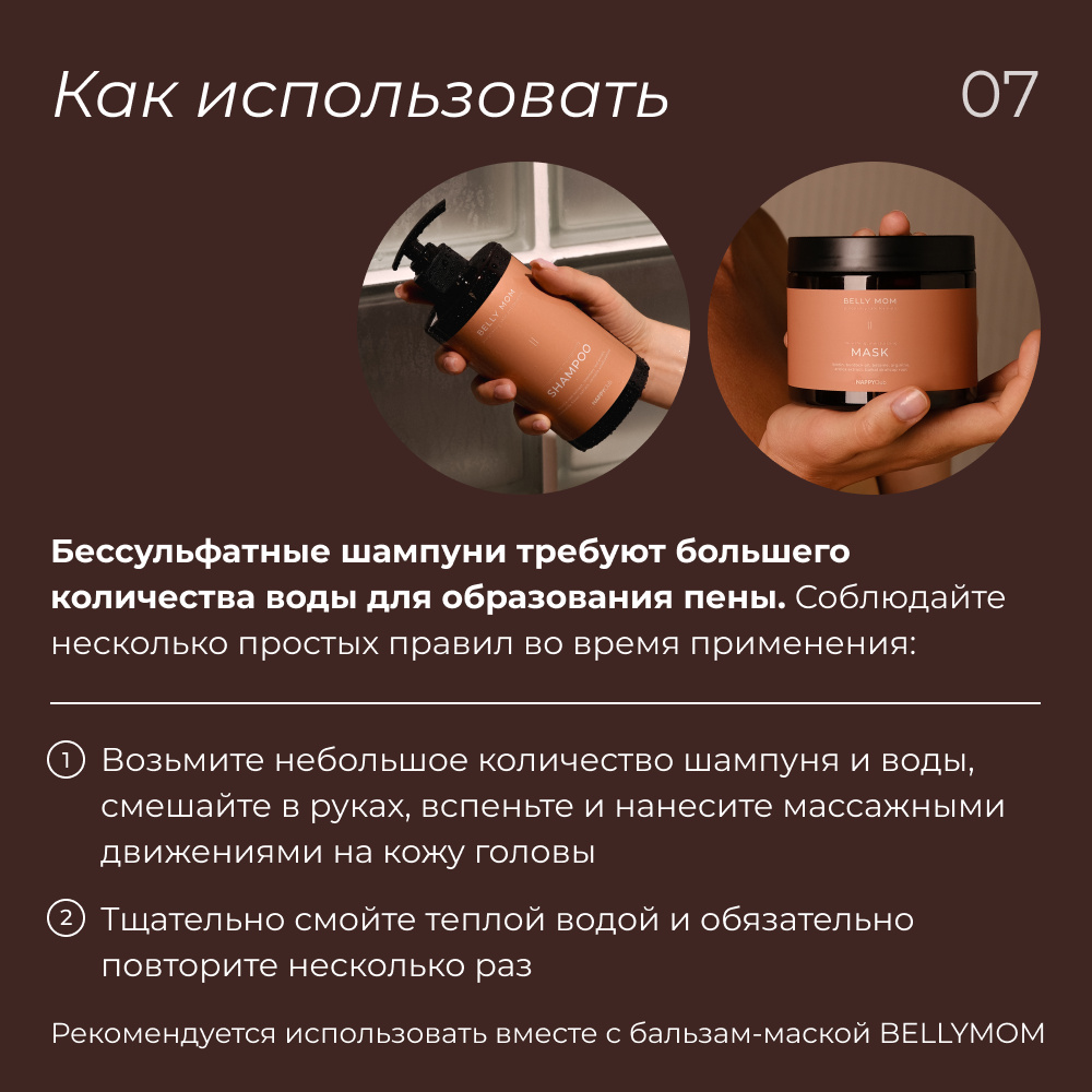 Эффективен в сочетании с бальзам-маской для волос BELLY MOM