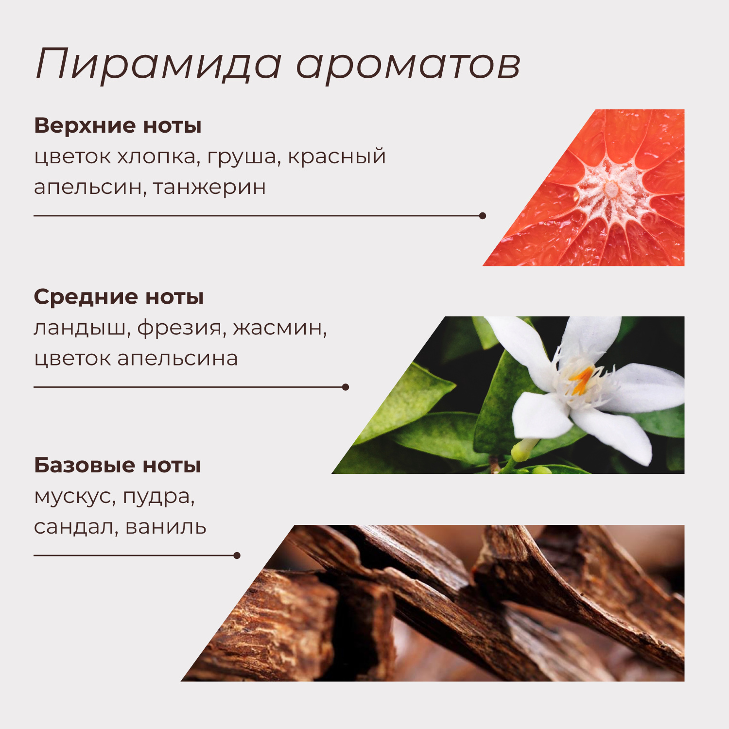 Верхние ноты: цветок хлопка, груша, красный апельсин, танжерин