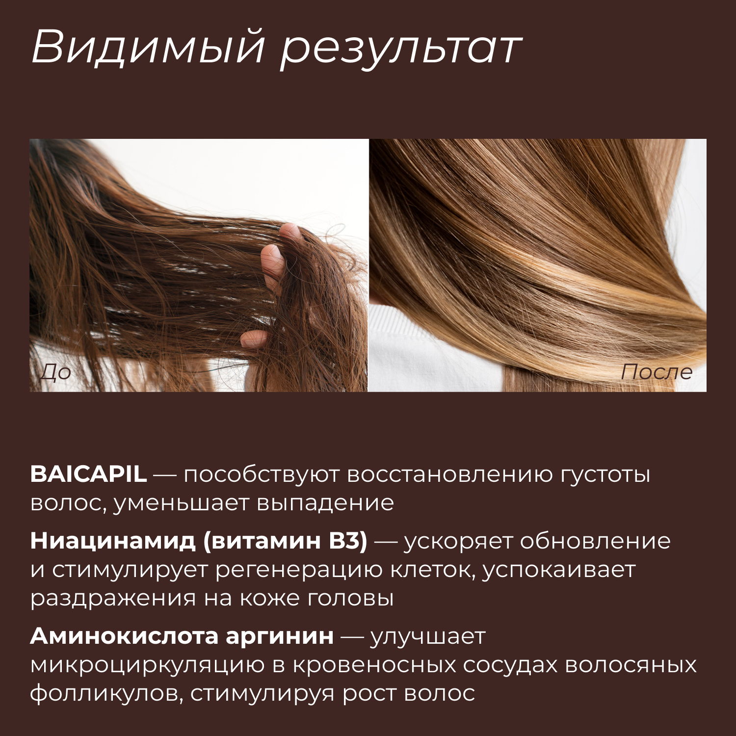 За восстановление волос отвечает запатентованный активный компонент BAICAPIL. Это комплекс из 4 растительных экстрактов: ростков сои, зародышей пшеницы, шлемника байкальского и цветков арники.
