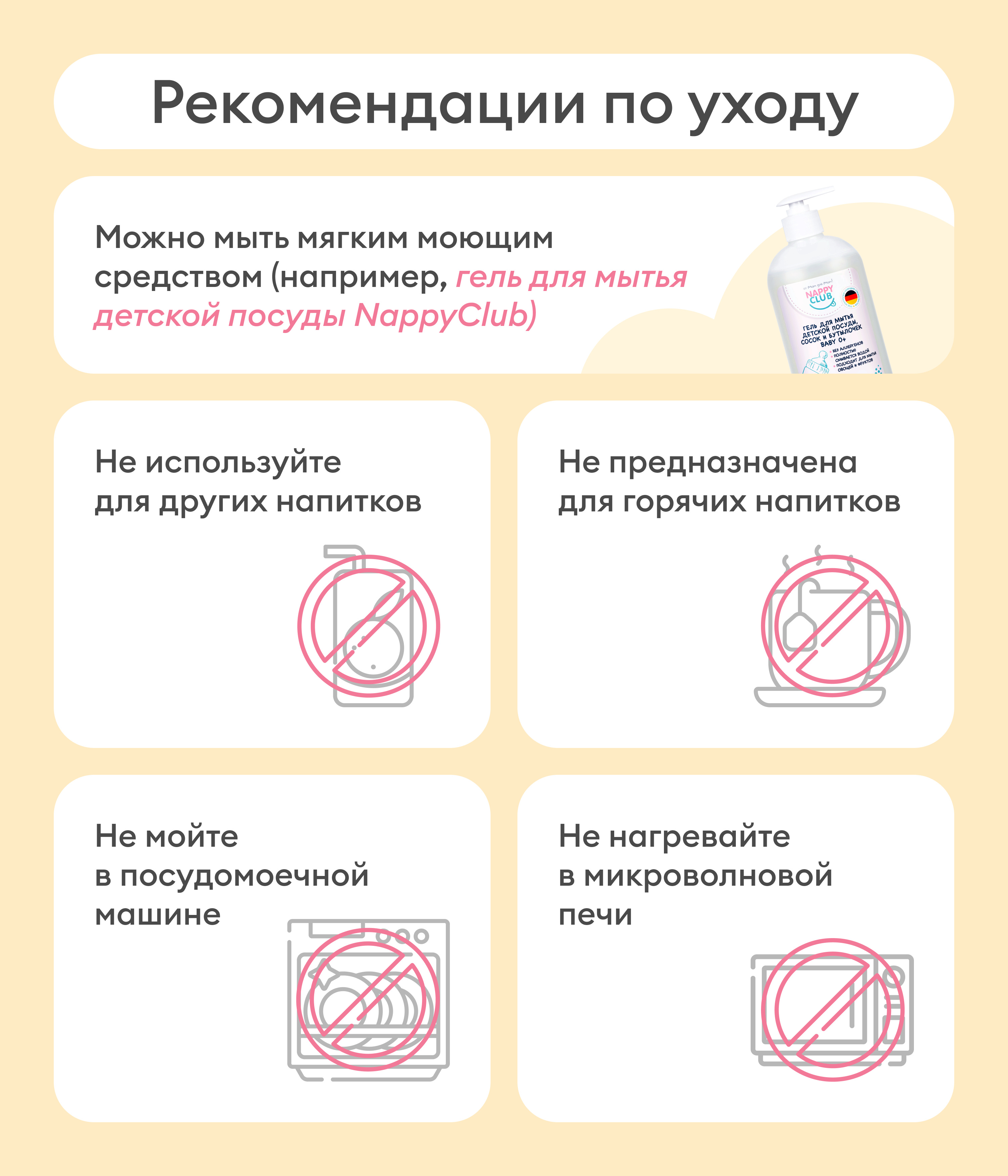 Не проводите дезинфекцию кипятком или паром, чтобы избежать деформации.
