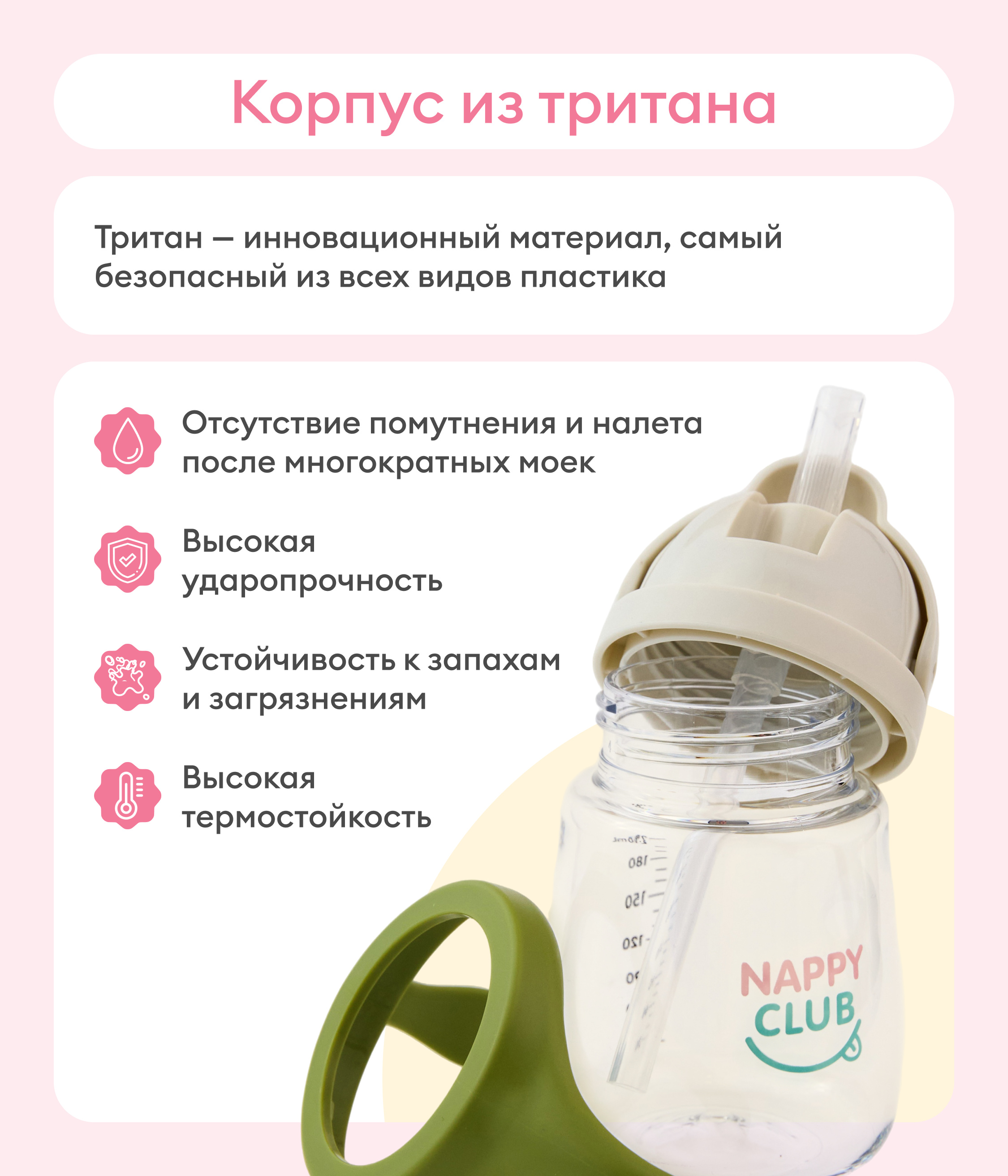 Корпус поильника выполнен из тритана — высококачественного, прочного и безопасного пластика, не содержащего BPA и других вредных веществ. Тритан устойчив к ударам и не впитывает запахи, что обеспечивает долговечность изделия и сохраняет чистоту напитков. Этот материал также легко моется и выдерживает частое использование, что очень удобно для повседневного применения.