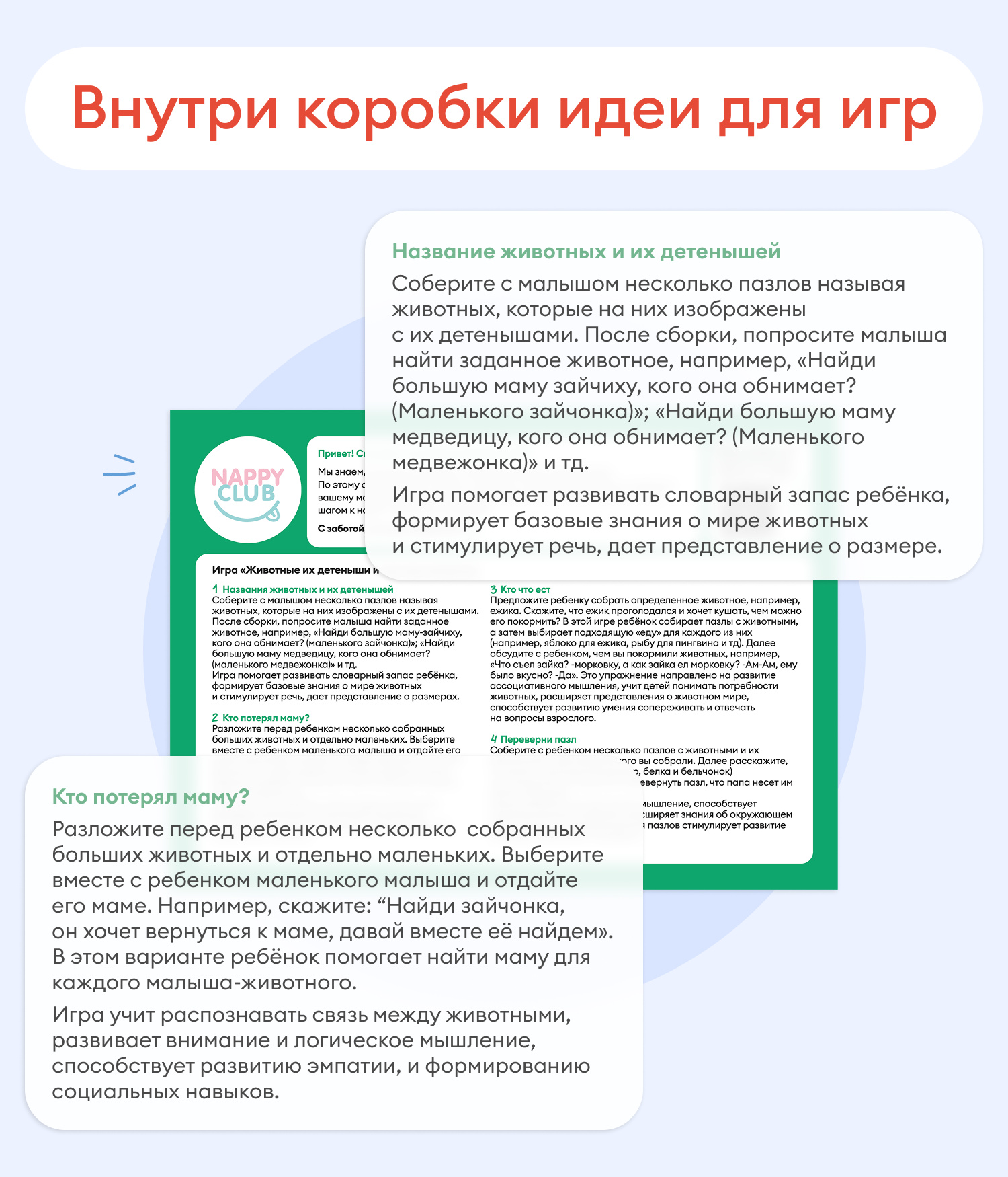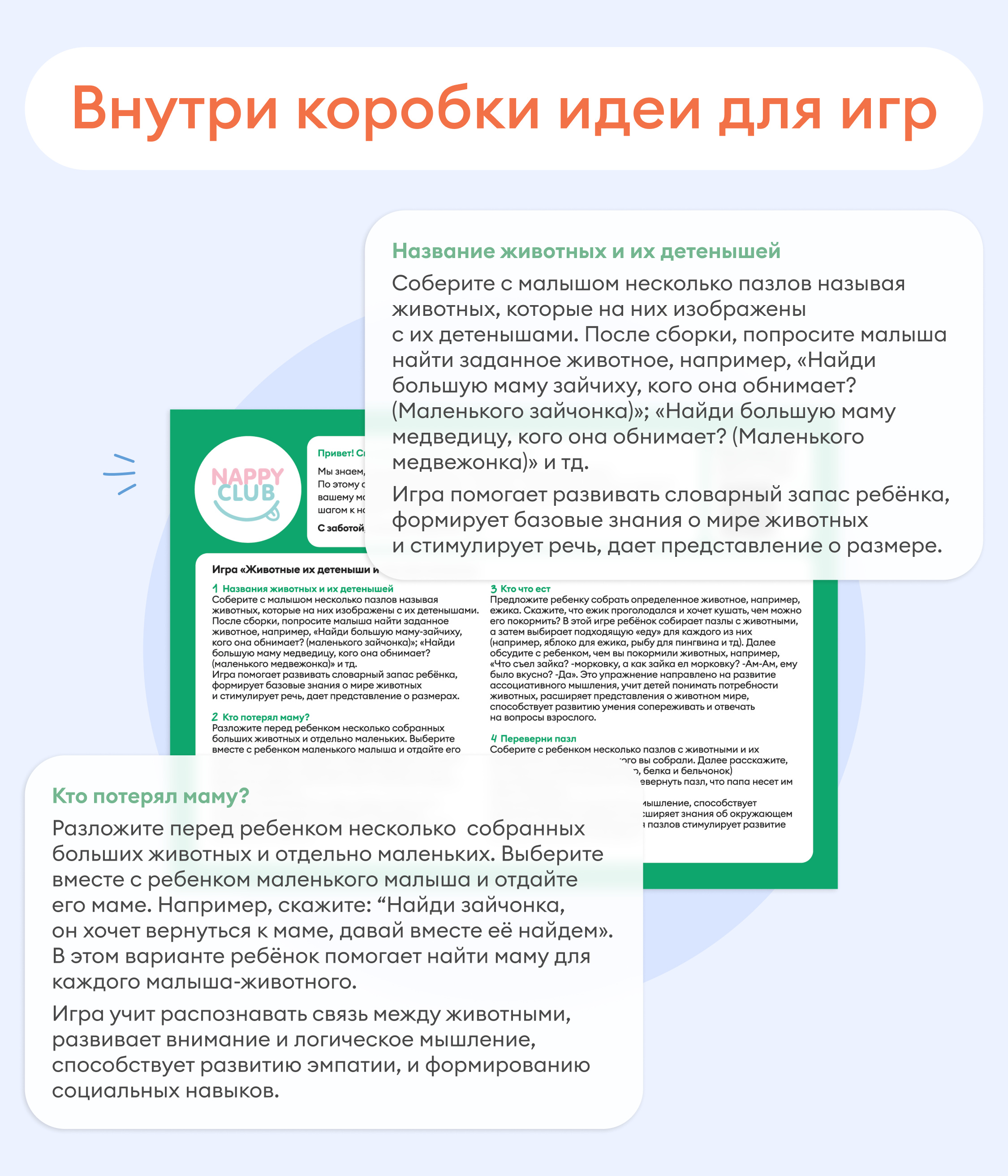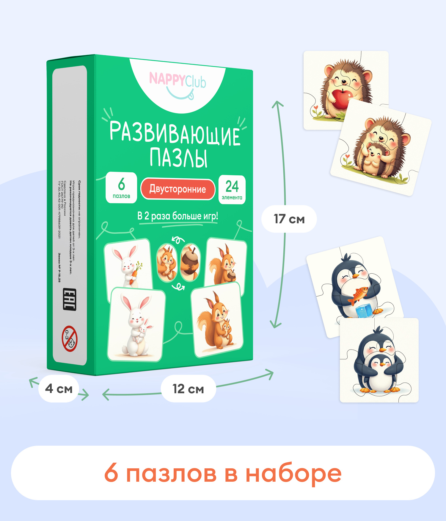 В комплекте: 6 пазлов, коробка, идеи для игр "ребенок + родитель"