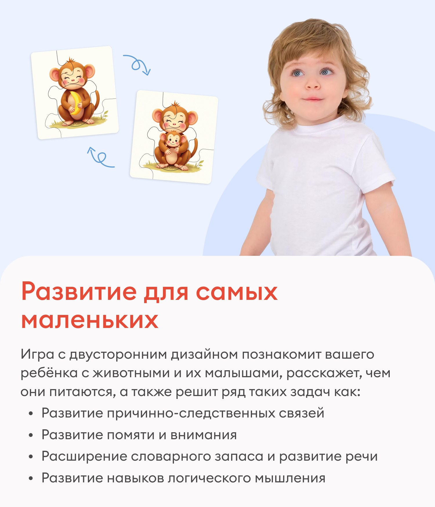 Идеальный первый пазл для малыша. Каждый пазл состоит из нескольких деталей мамы и детали малыша, фигуры крупные и удобно ложатся в детскую ручку. Пазл для малышей изготовлен из прочного жесткого картона с глянцевым покрытием. Крупные детали пазла помогают развивать мышление, мелкую моторику рук, логику, память, расширяют словарный запас у малышей.