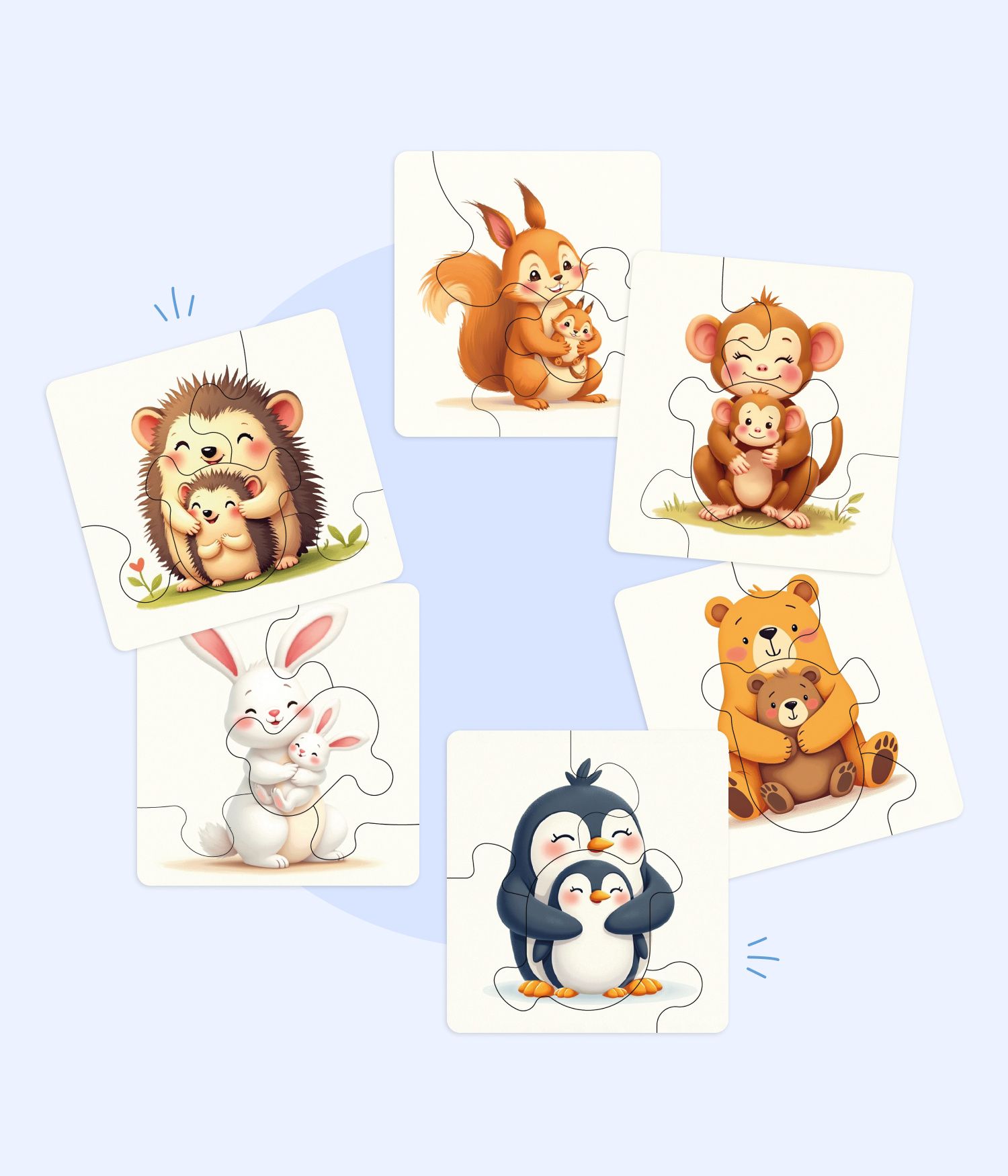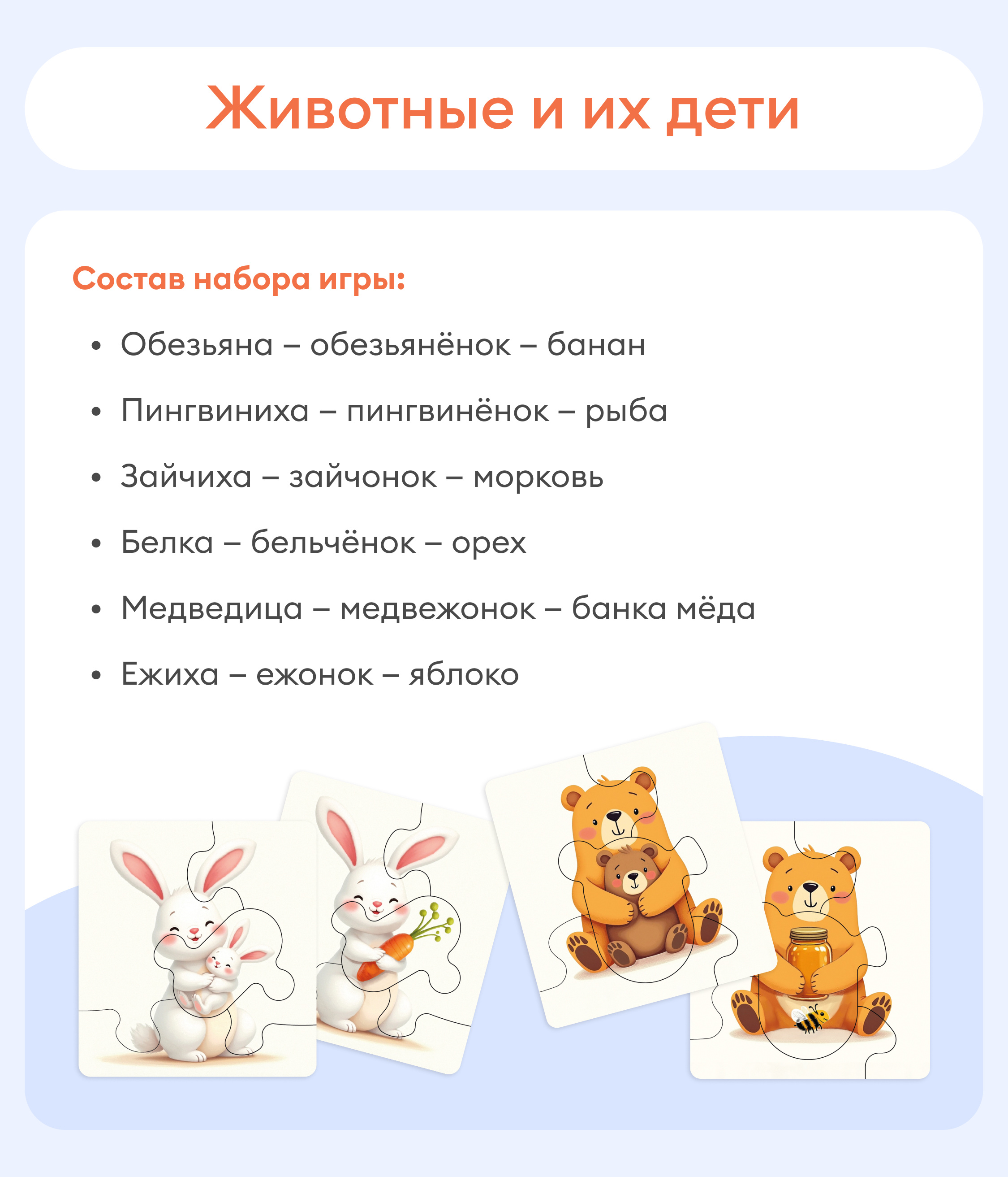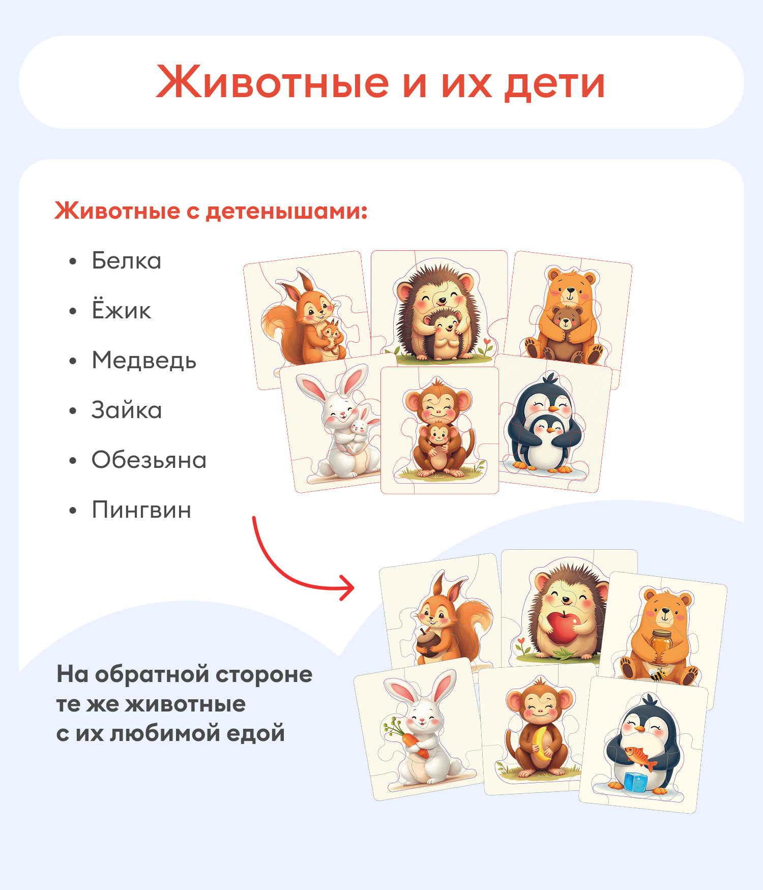 В наборе «Животные и их дети» вы найдёте 6 животных, а также вариации их деток, либо лакомств на другой стороне частей пазла. 6 милых, очаровательных представителей животного мира однозначно заинтересуют вашего малыша.
