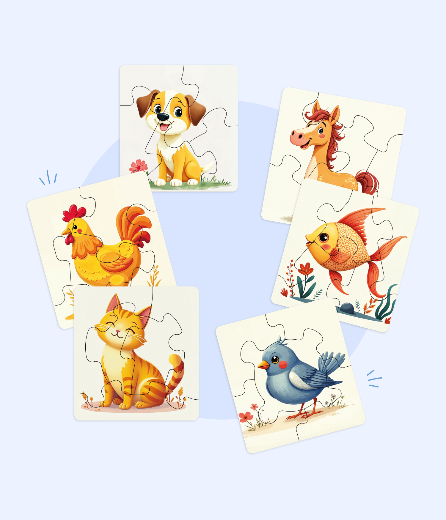 В наборе «Животные и их дома» вы найдёте 6 животных, а также вариации их домиков на обратной стороне частей пазла. 6 милых, очаровательных представителей животного мира однозначно заинтересуют вашего малыша.