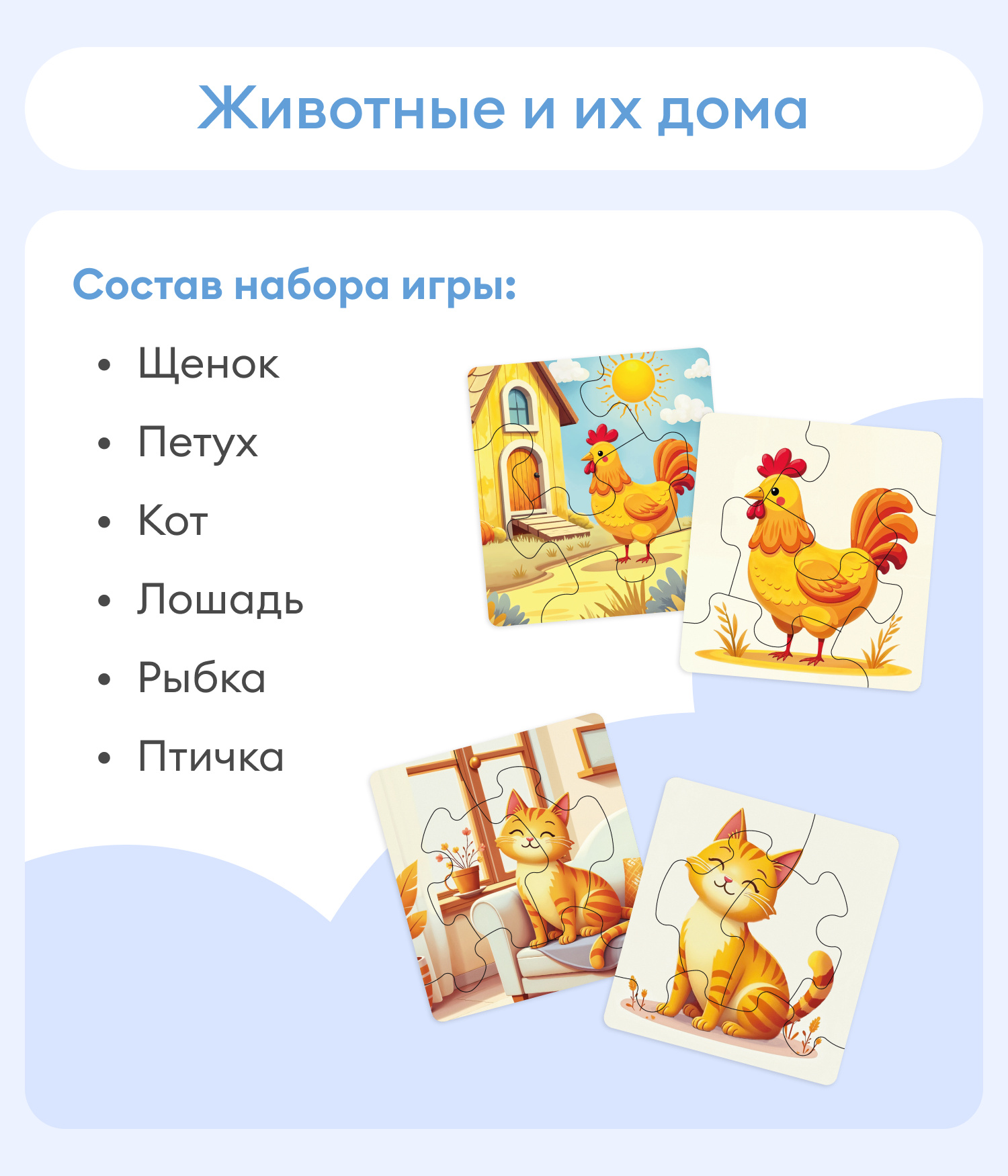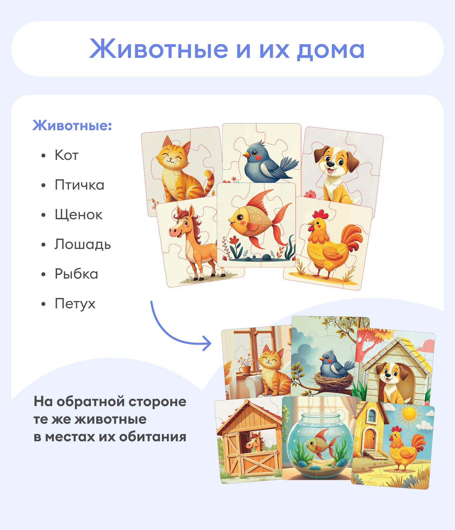 Идеальный первый пазл для малыша. Каждый пазл состоит из нескольких деталей животного и его домика, фигуры крупные и удобно ложатся в детскую ручку. Пазл для малышей изготовлен из прочного жесткого картона с глянцевым покрытием. Крупные детали пазла помогают развивать мышление, мелкую моторику рук, логику, память, расширяют словарный запас у малышей.