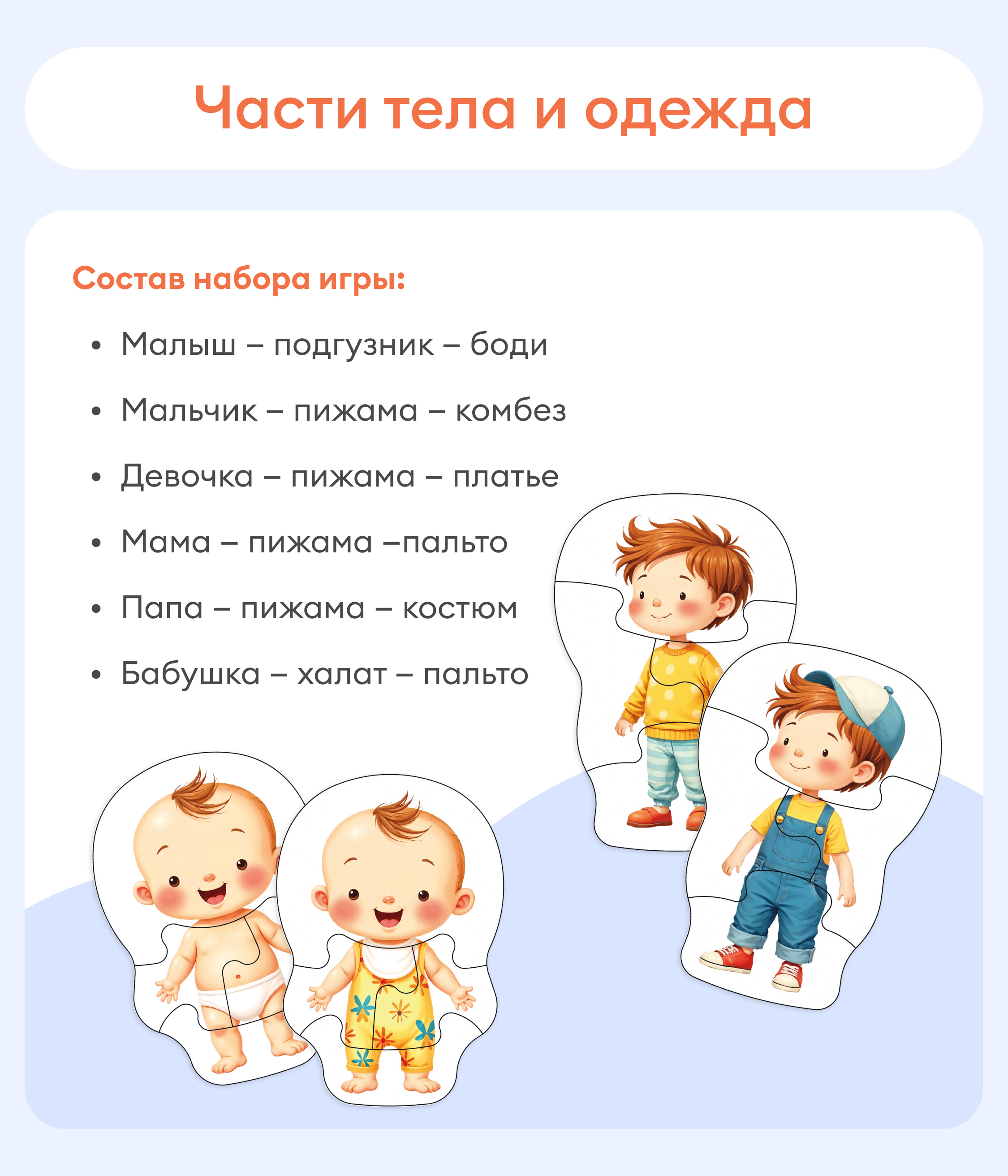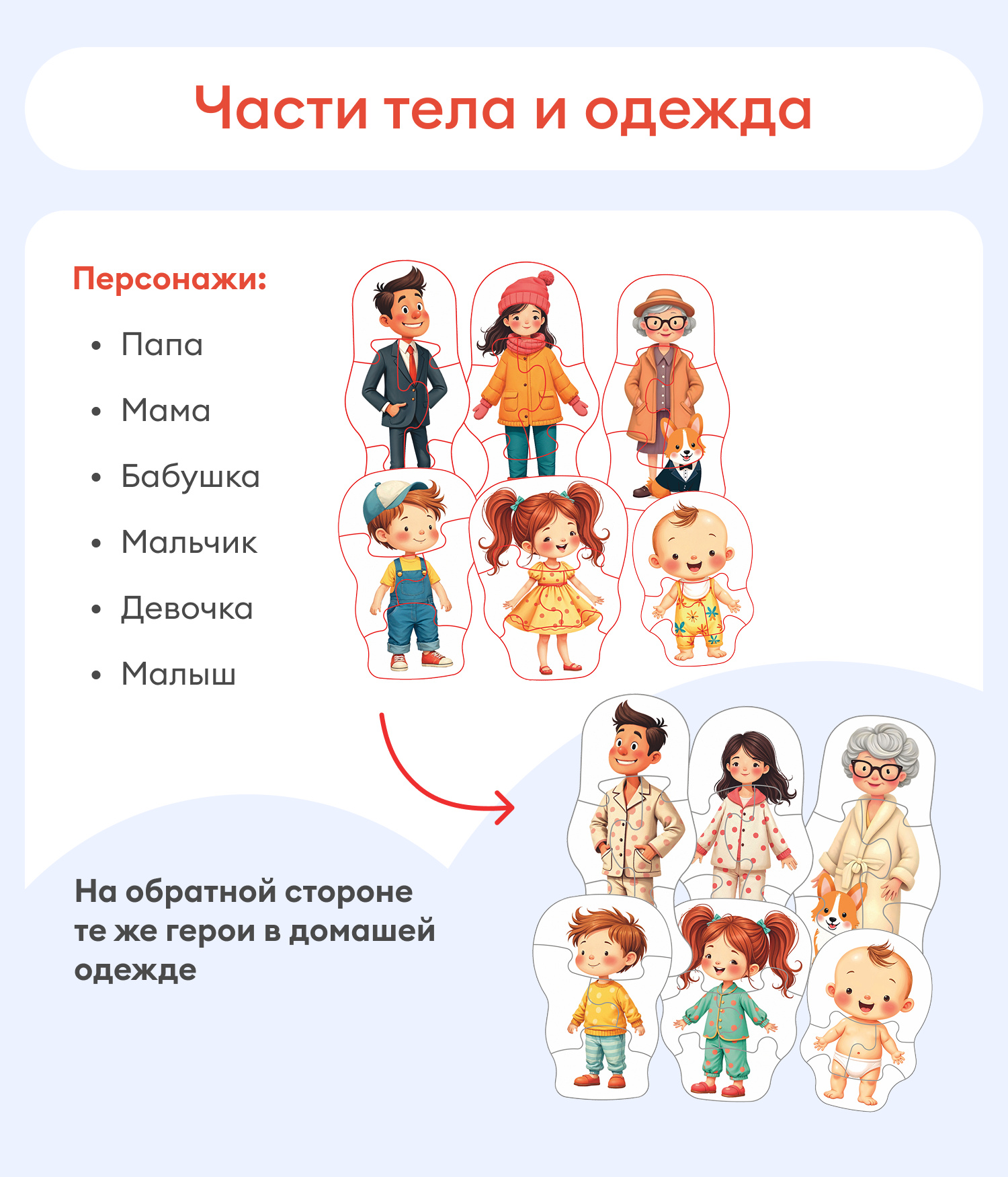 В наборе «Части тела и одежда» вы найдёте 6 разных людей, а также вариации их нарядов на другой стороне частей пазла. 6 милых, очаровательных представителей разного поколения однозначно заинтересуют вашего малыша.