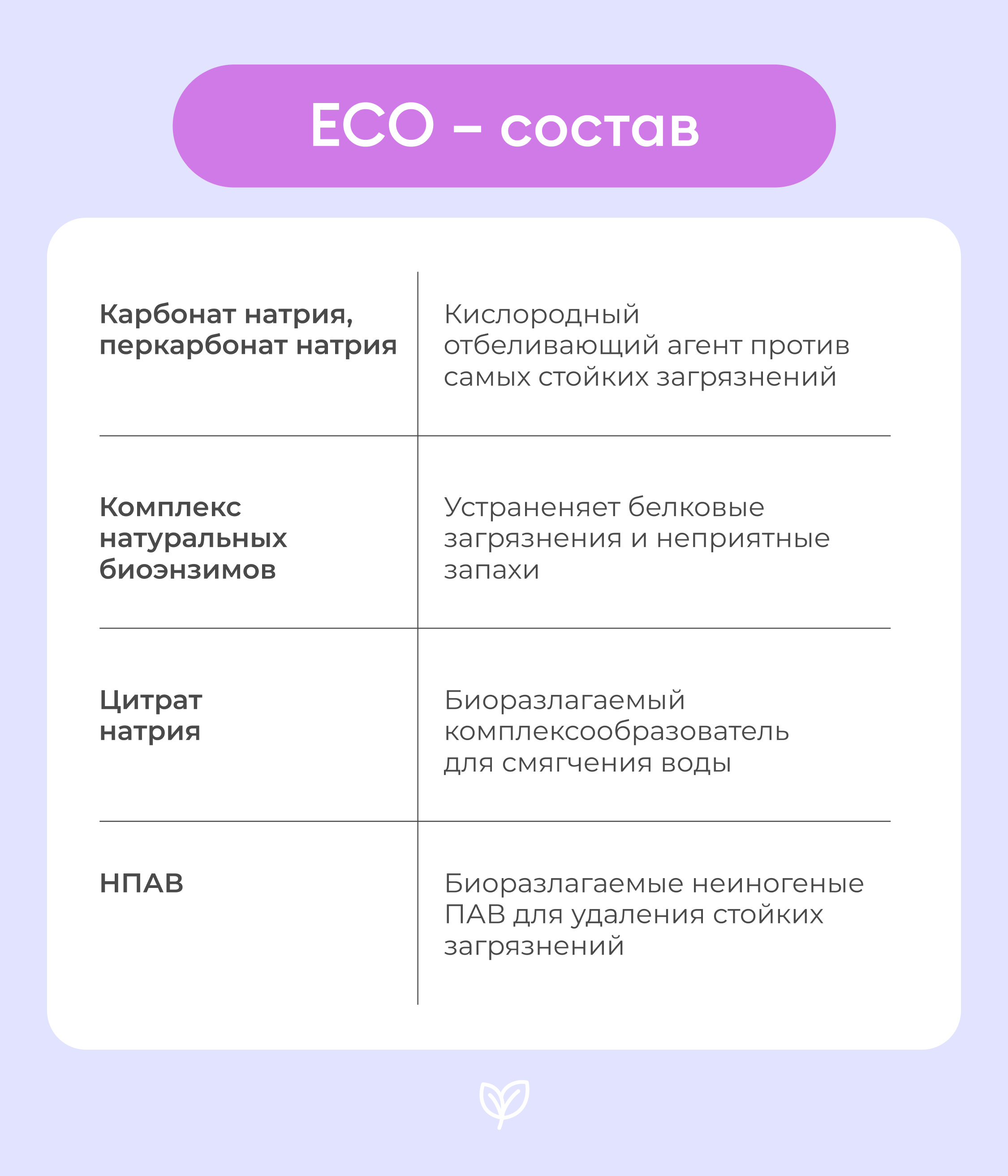 Карбонат натрия, хлорид натрия, цитрат натрия, перкарбонат натрия, энзимы, поликарбоксилат, комплексообразователи.