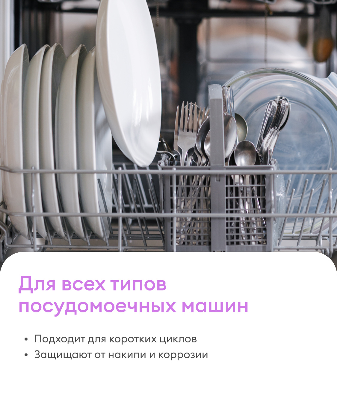 Специальная формула защищает вашу посудомоечную машину от накипи и коррозии, продлевая ее срок службы.
