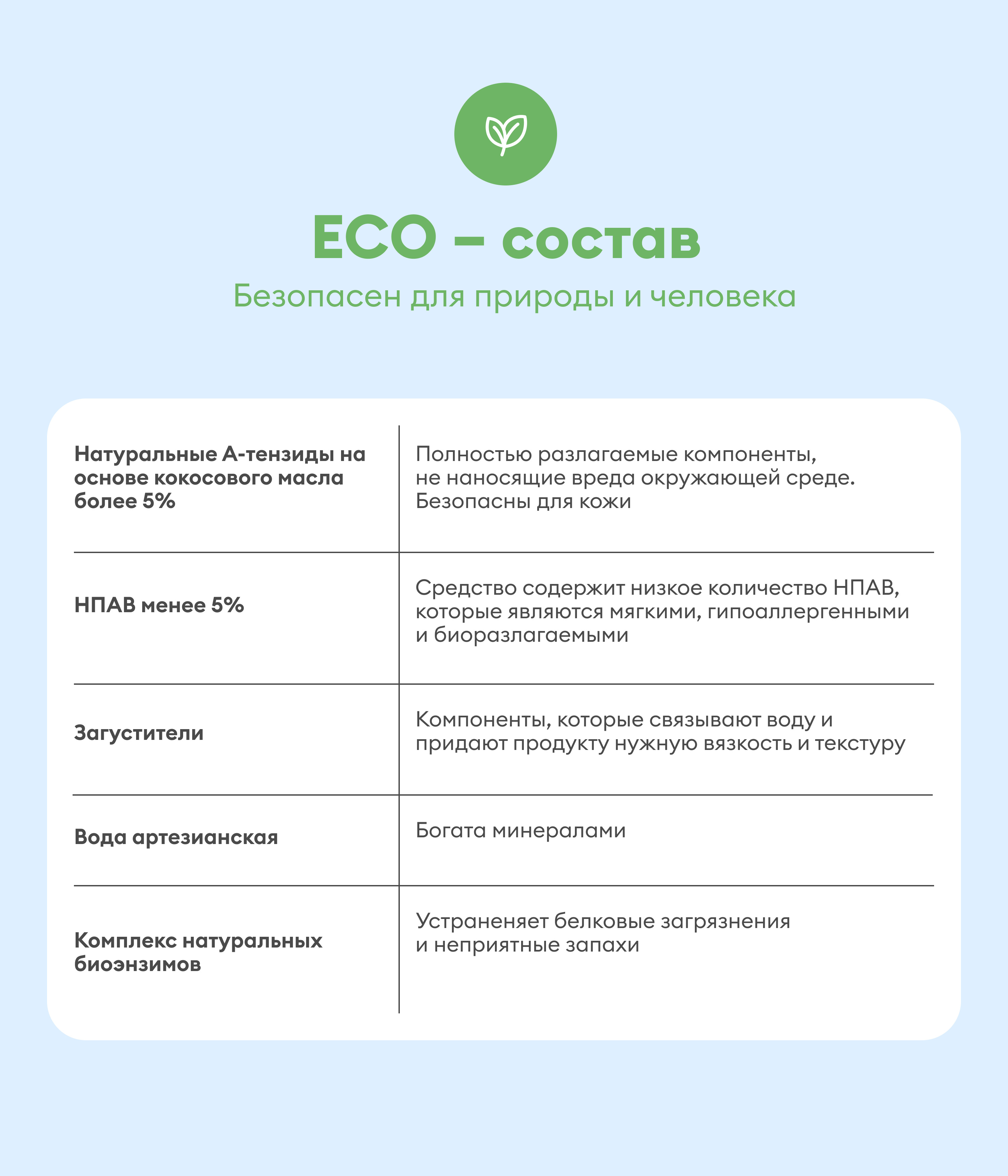 Натуральные А-тензиды на основе кокосового масла более 5%, НПАВ менее 5%, загуститель, вода артезианская, комплекс энзимов.