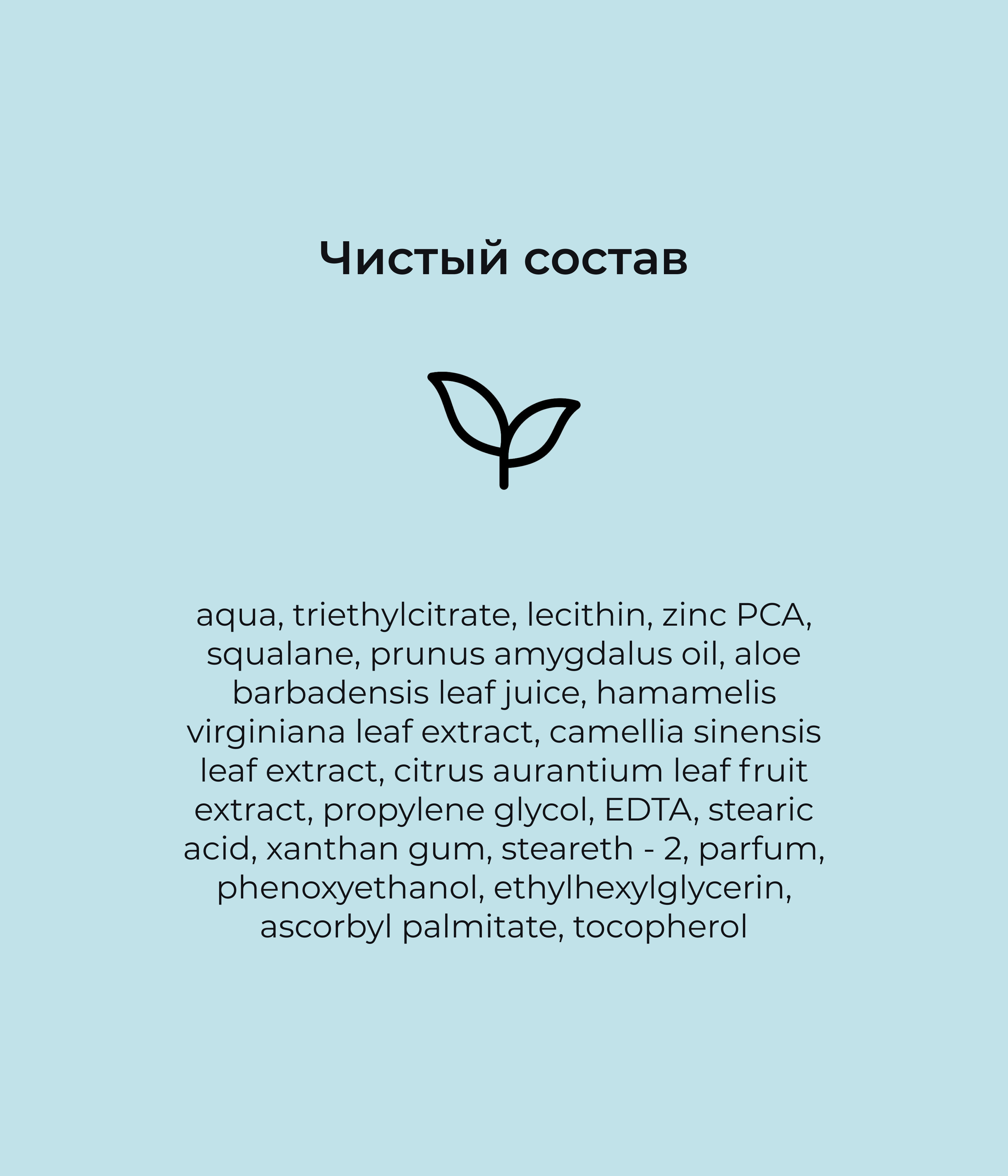 Aqua, triethyl citrate, lecithin, zinc PCA, squalane, prunus amygdalus oil, aloe barbadensis leaf juice, hamamelis virginiana leaf extract, camellia sinensis leaf extract, citrus aurantium leaf fruit extract, propylene glycol, EDTA, stearic acid, steareth - 2, phenoxyethanol, ethylhexylglycerin, ascorbyl palmitate, tocopherol.