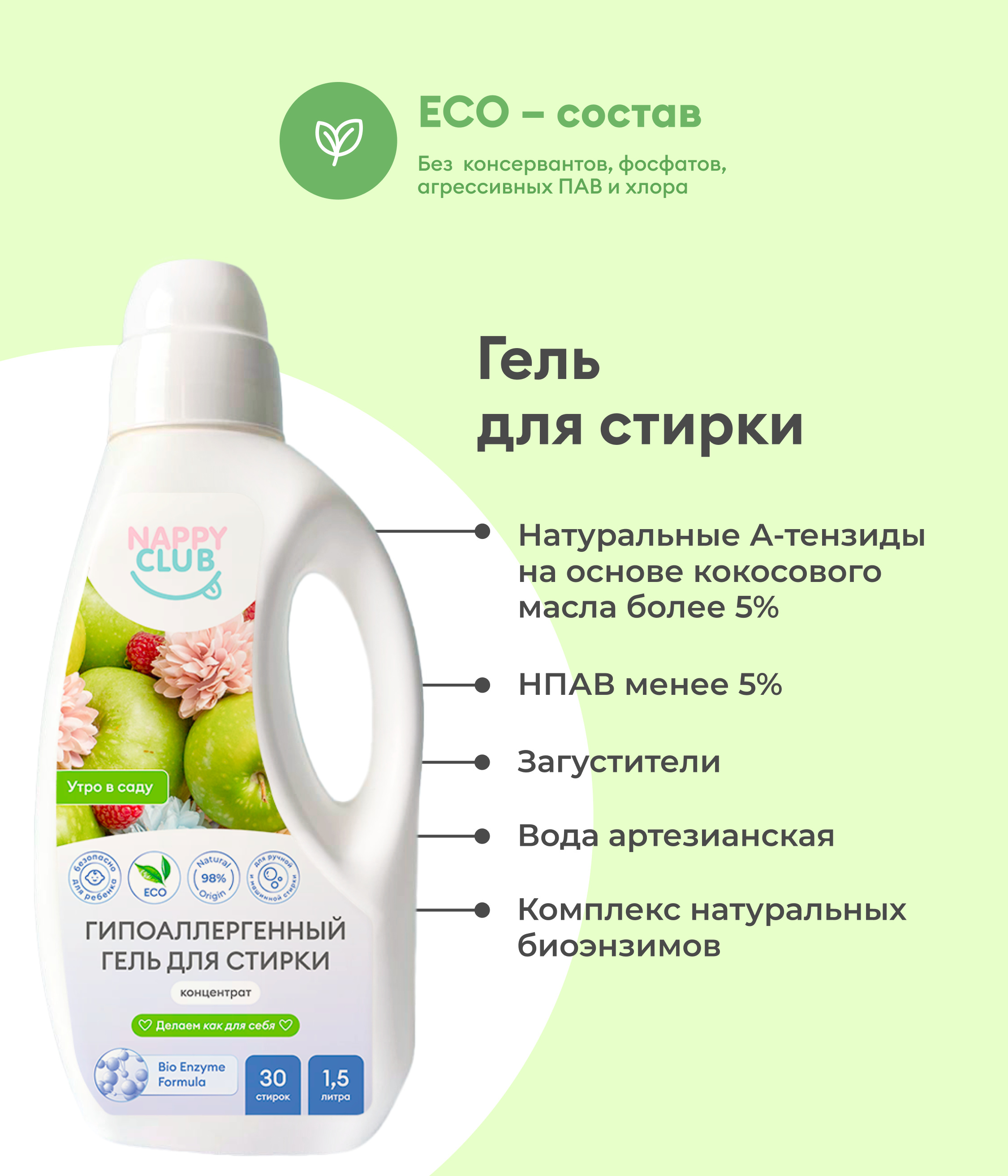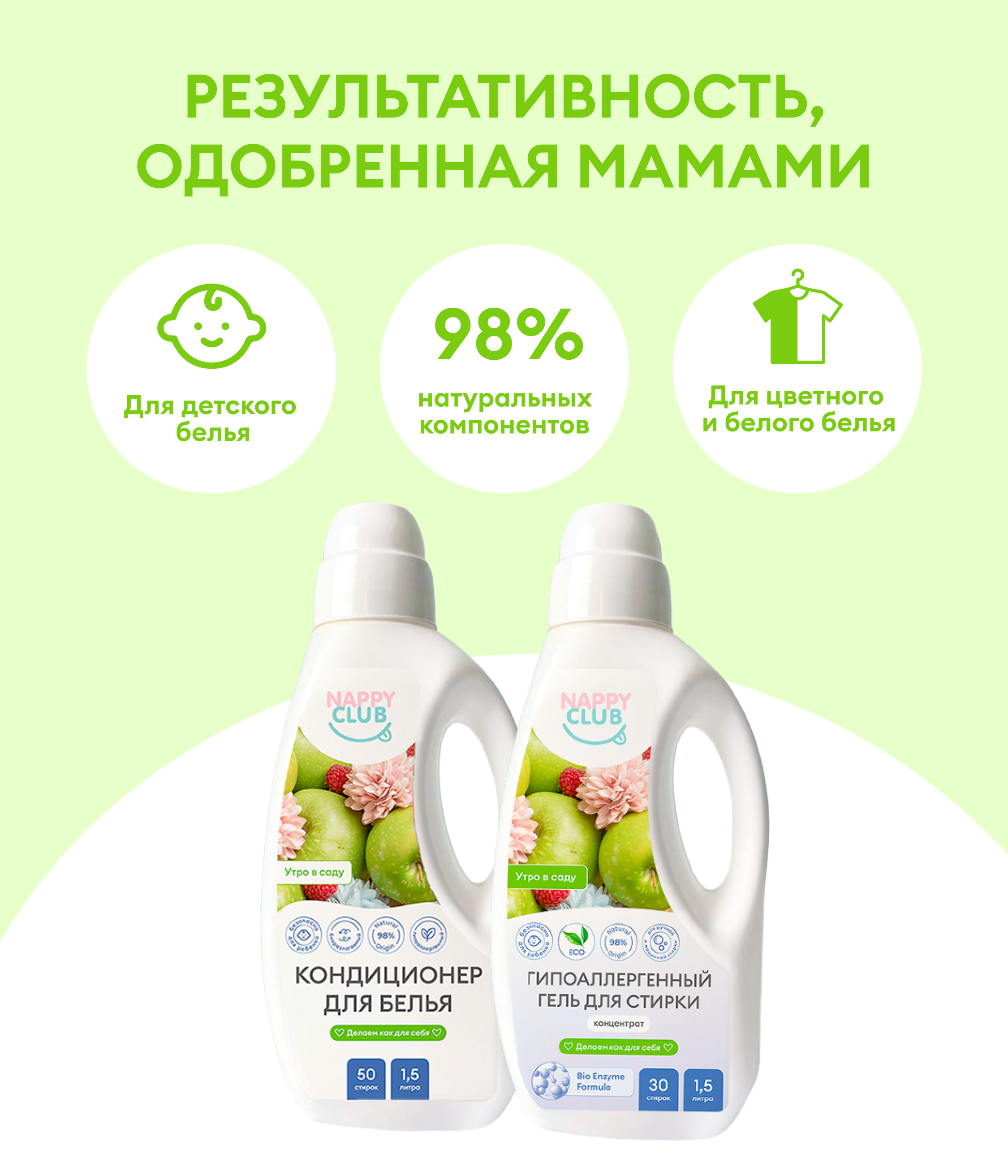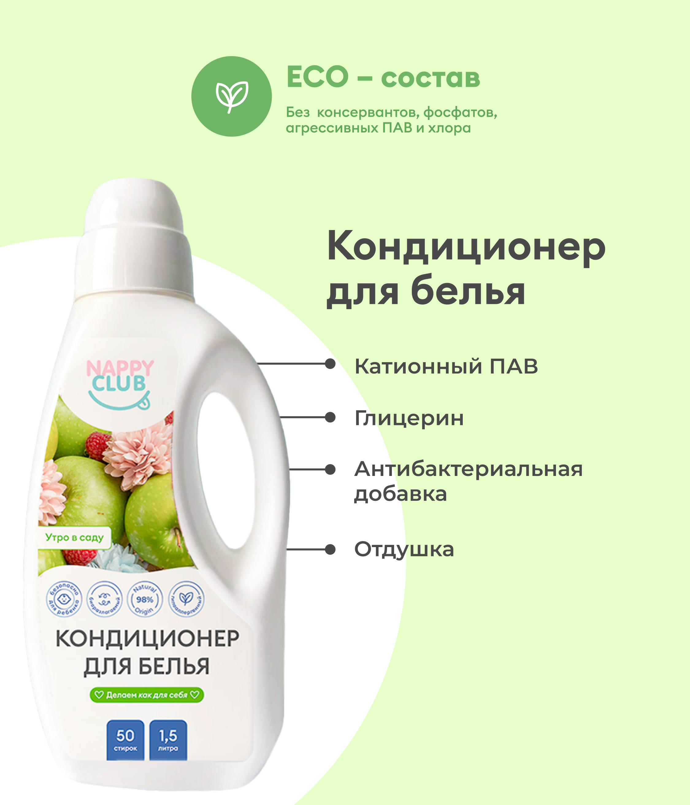Преимущества кондиционера для белья Nappy Club "Утро в саду" 1,5 л