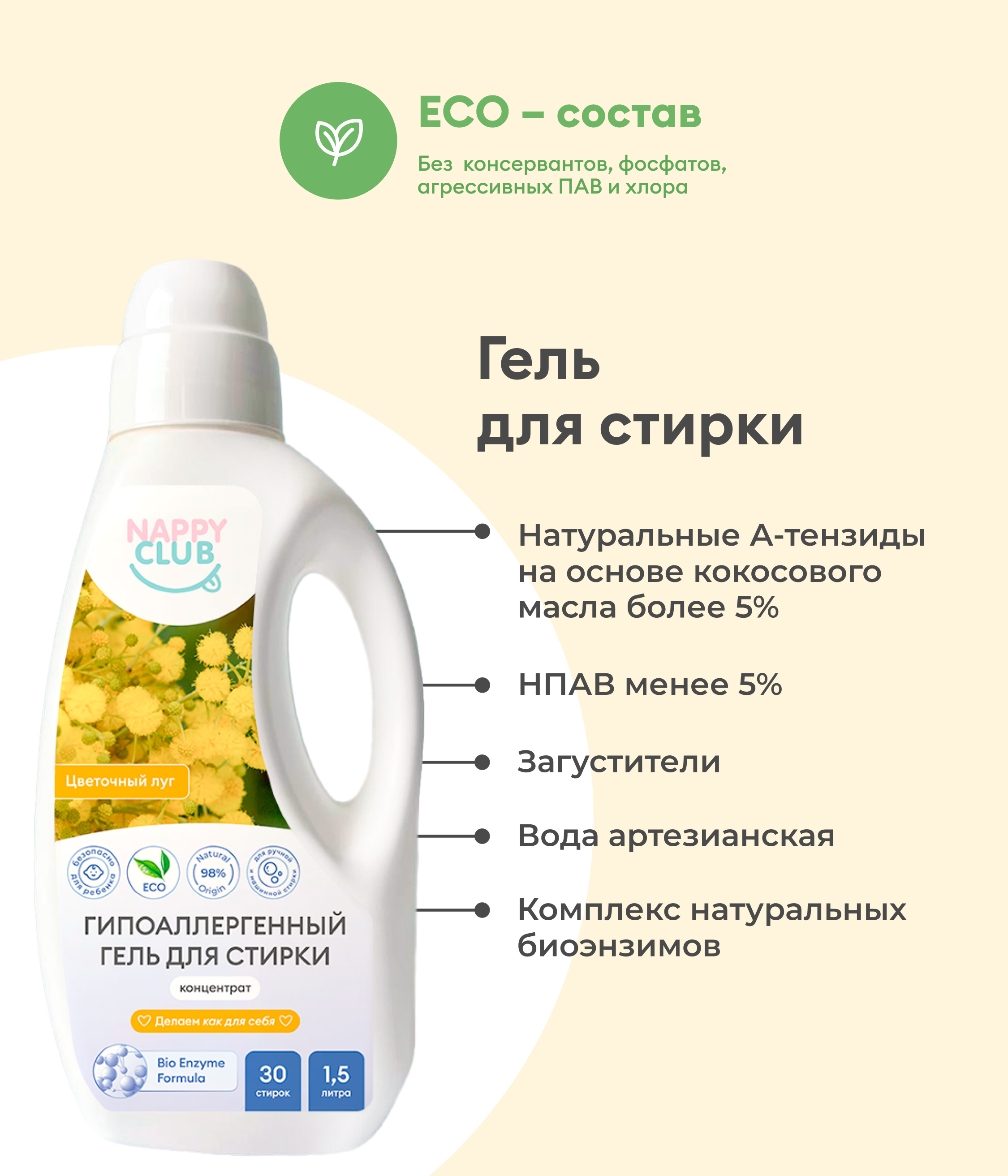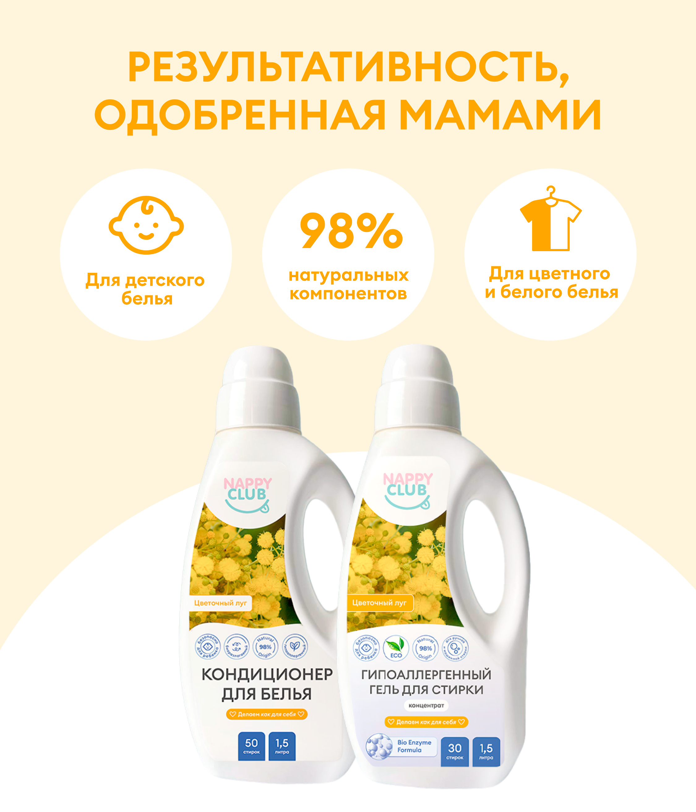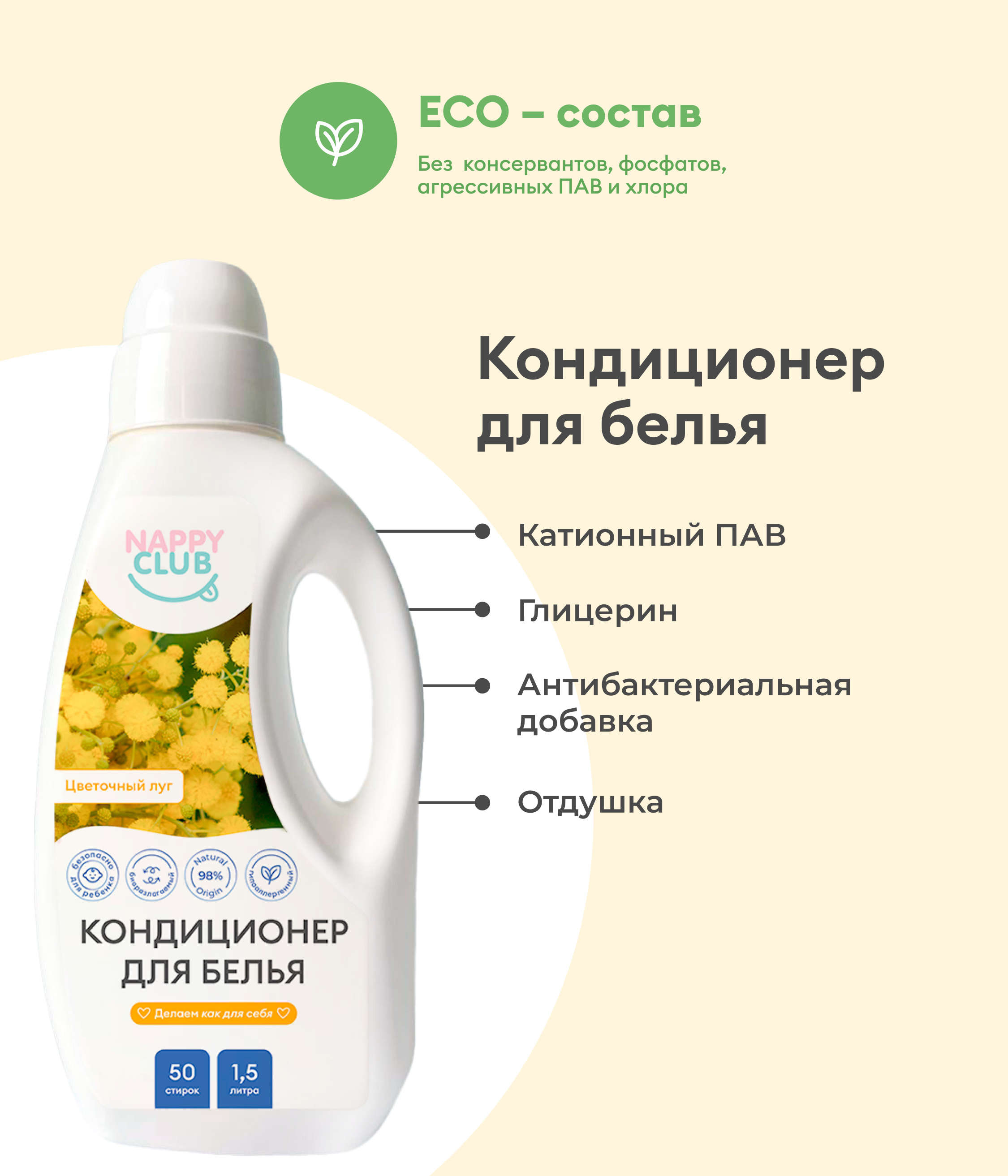 Преимущества кондиционера для белья Nappy Club "Цветочный луг" 1,5 л