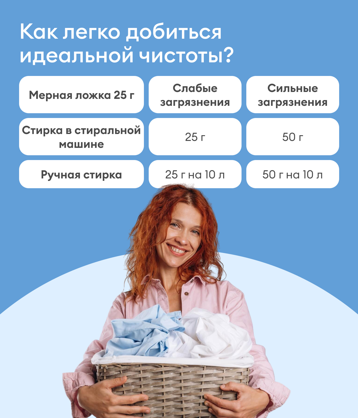 Универсальный кислородный пятновыводитель эффективно справляется с загрязнениями, оставляя белье чистым даже при использовании в холодной воде.