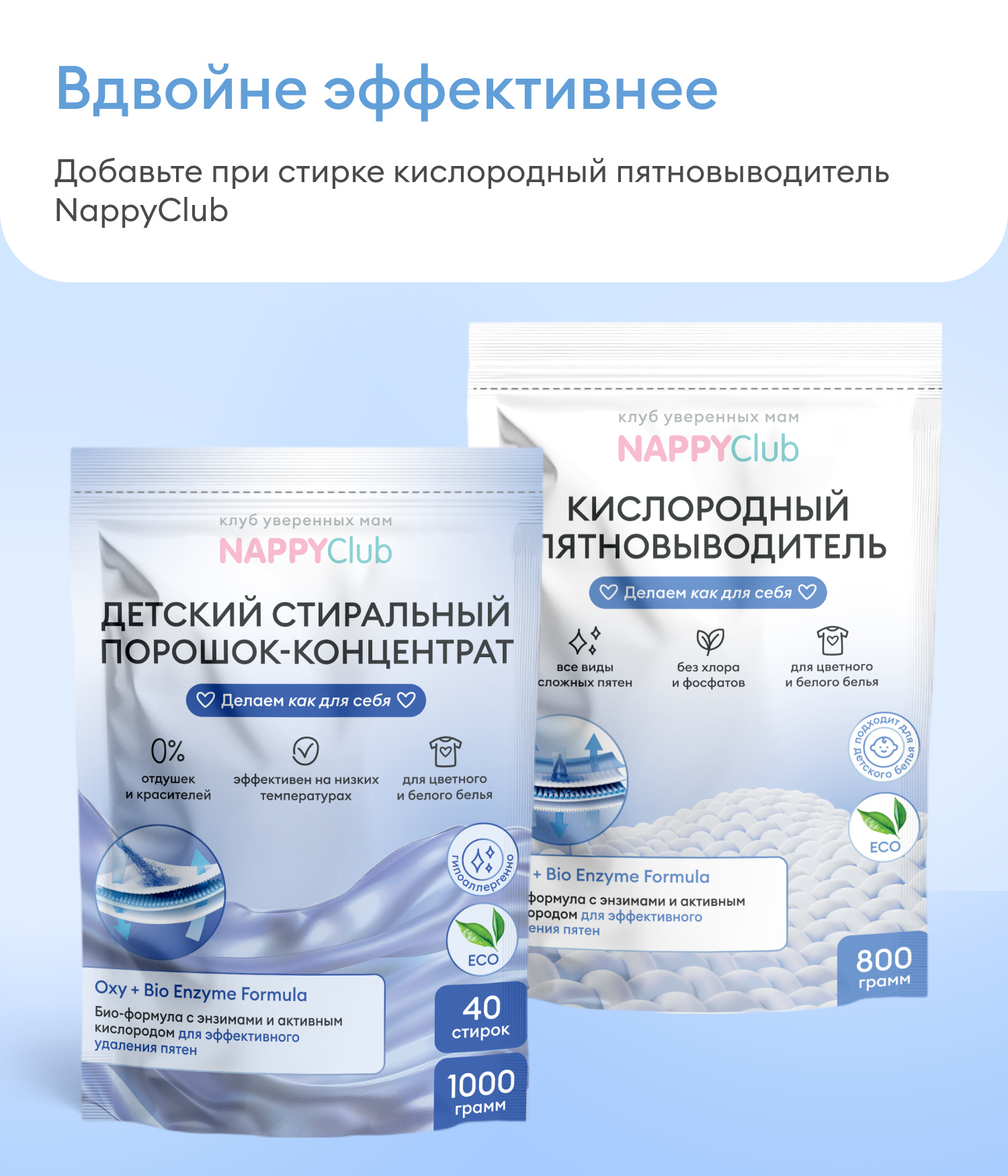Благодаря средствам NappyClub на основе кислорода, такой стиральный порошок безопасен для кожных покровов взрослых и детей, он подходит даже для очень чувствительной кожи малыша. В составе нет вредных веществ, что позволяет рекомендовать его для ежедневного использования.