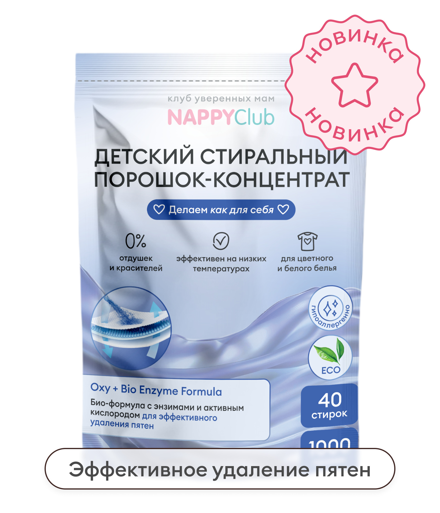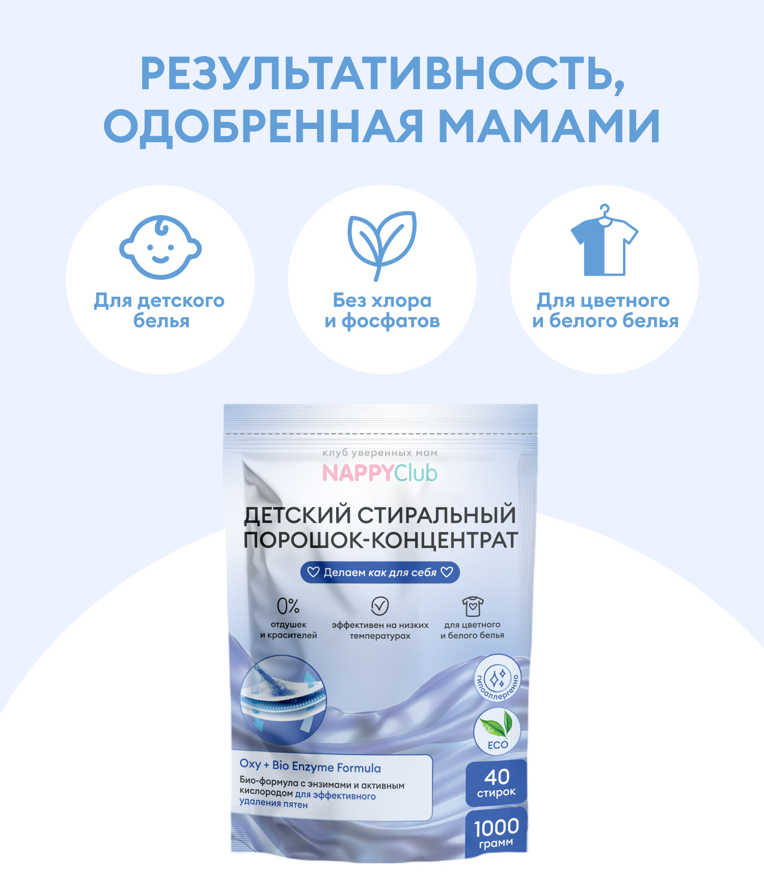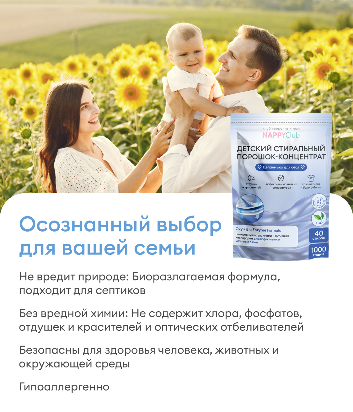 Стиральный порошок-концентрат от NappyClub 1кг подойдет для всей семьи и сохранит бюджет для более приятных трат.