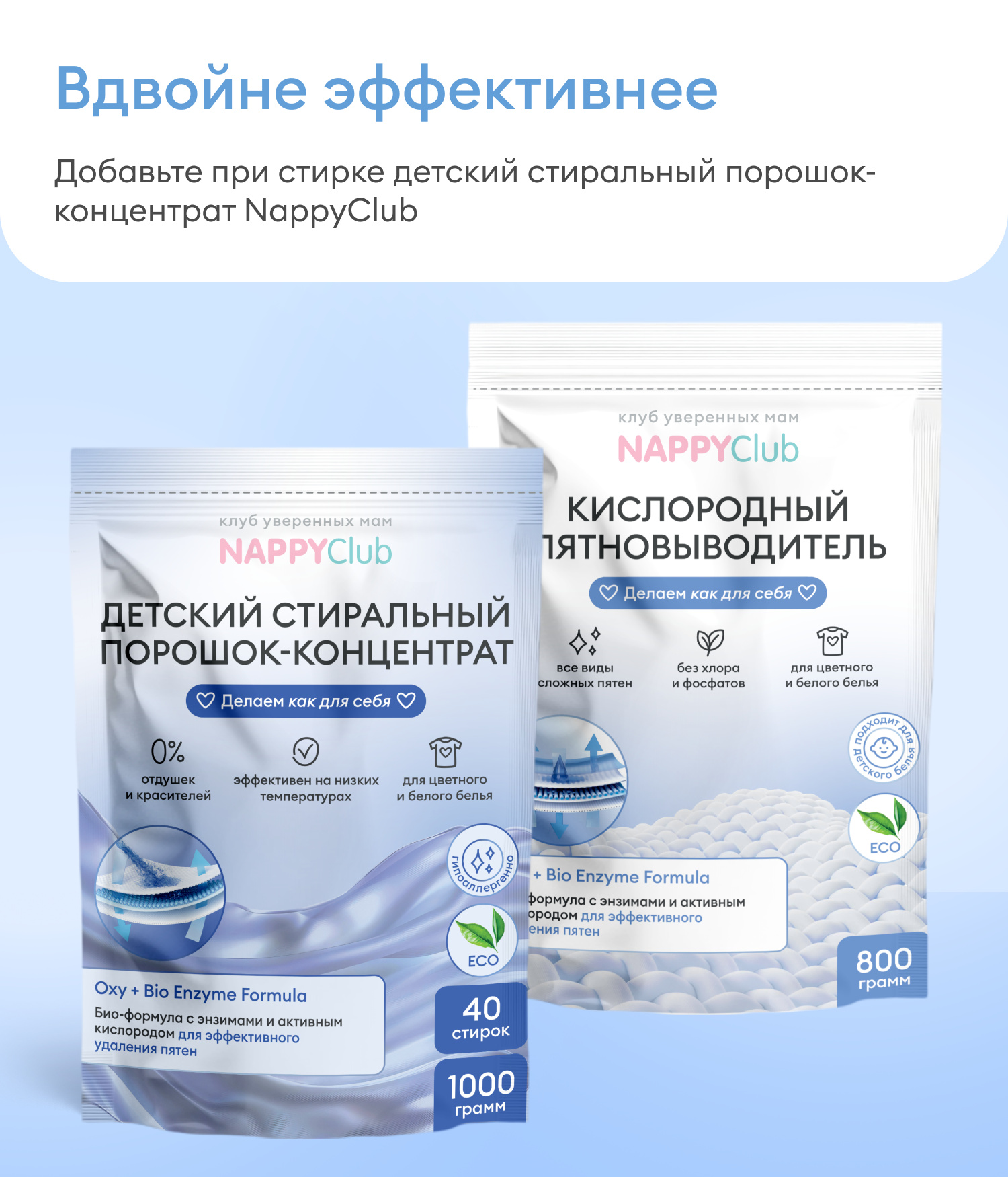 Активный кислород NappyClubb мягко, но глубоко проникает в волокна, возвращая белым тканям свежесть, а цветным — насыщенность без повреждений.