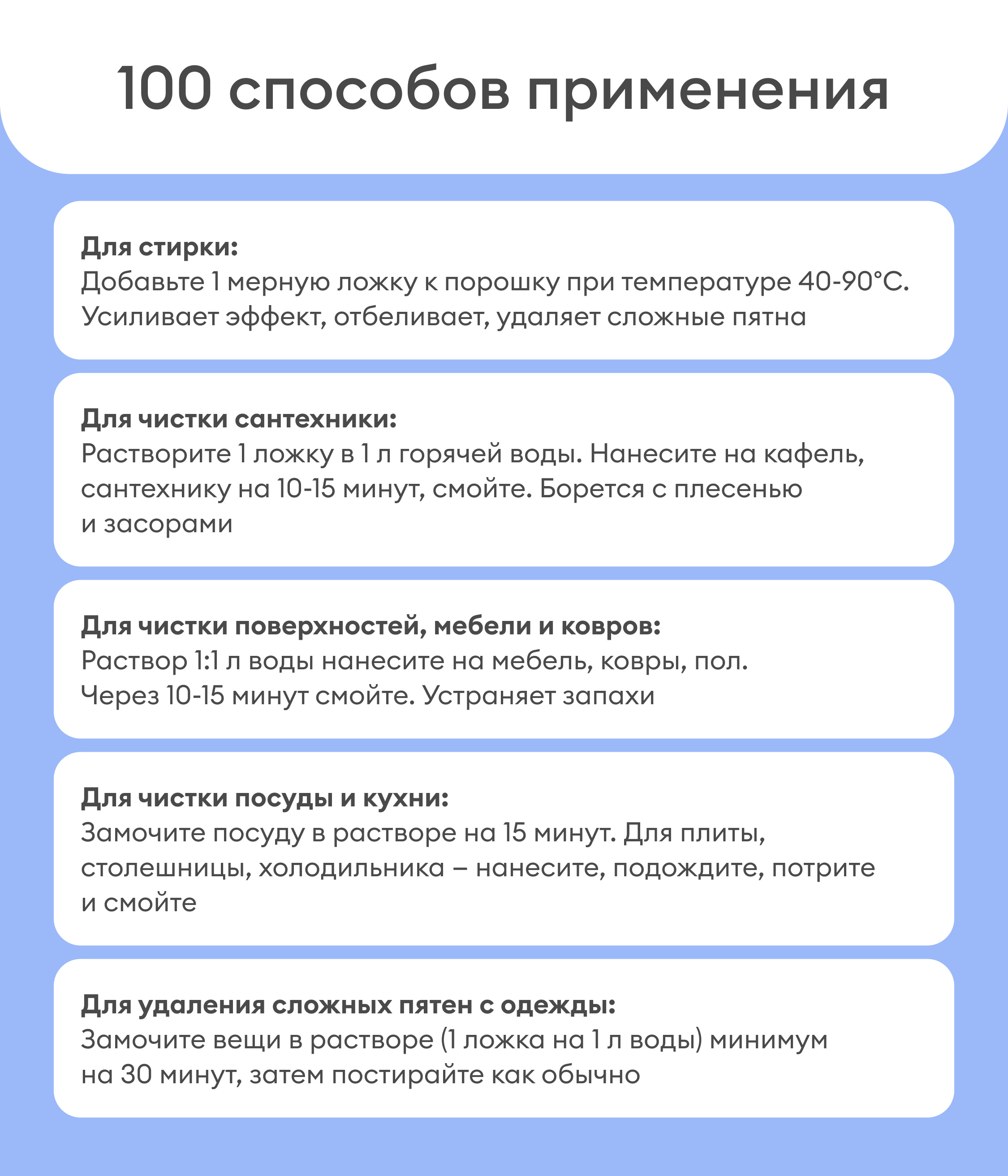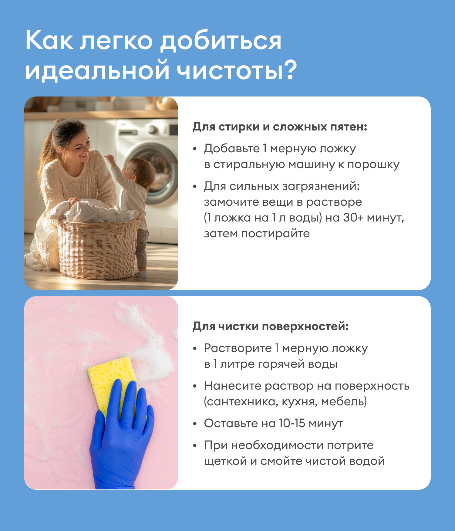 Универсальный отбеливатель-пятновыводитель подходит для домашнего использования, обеспечивая качественный уход за одеждой с первого применения.