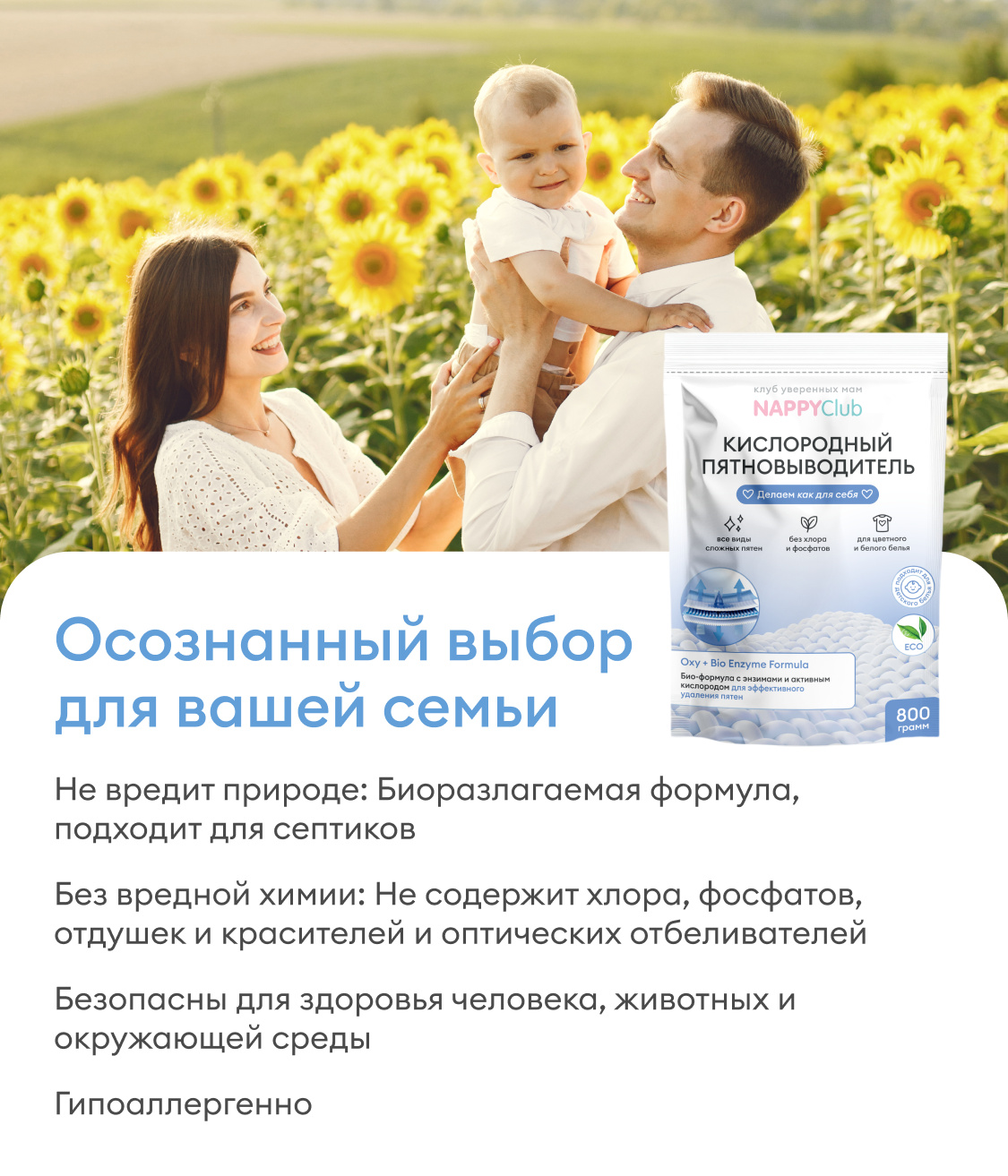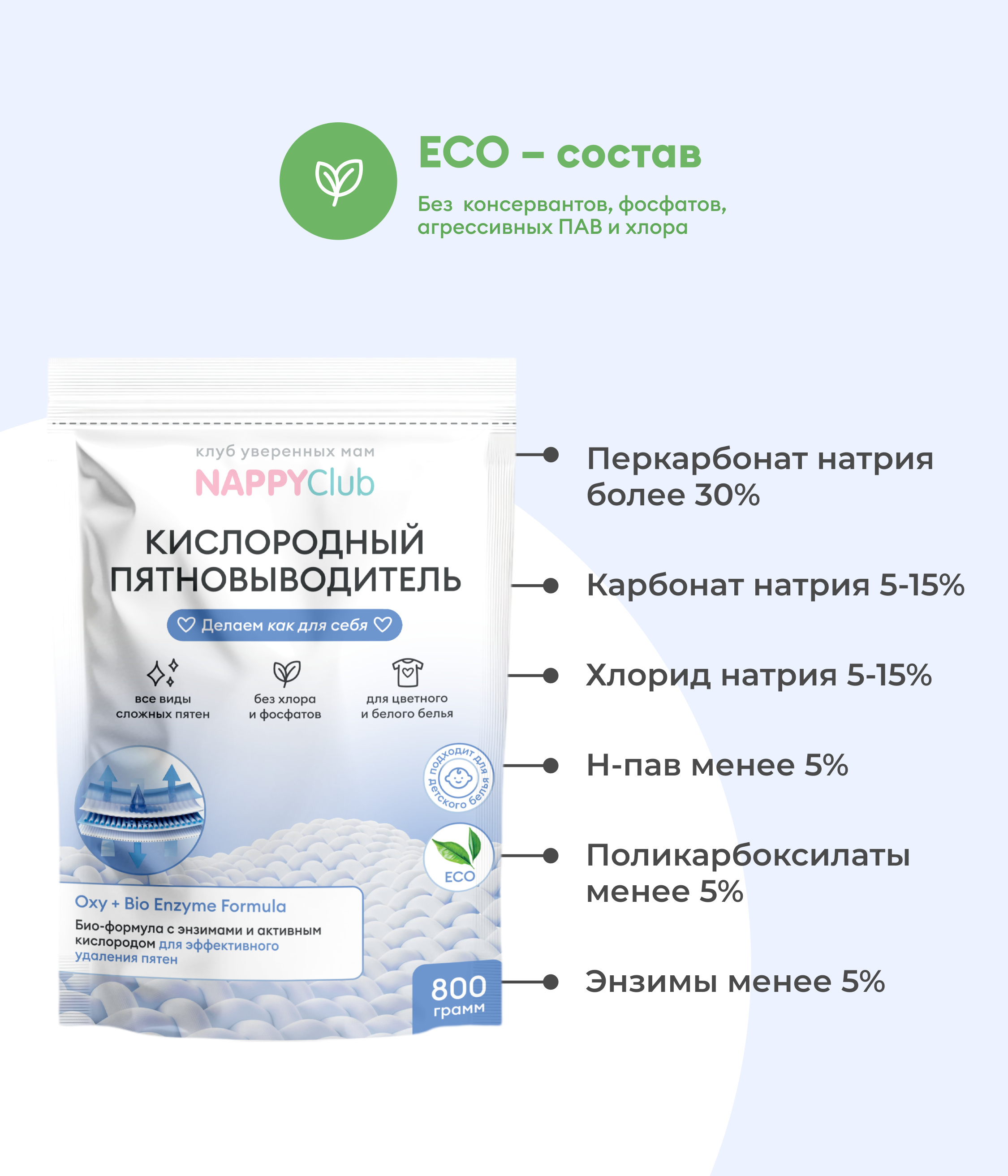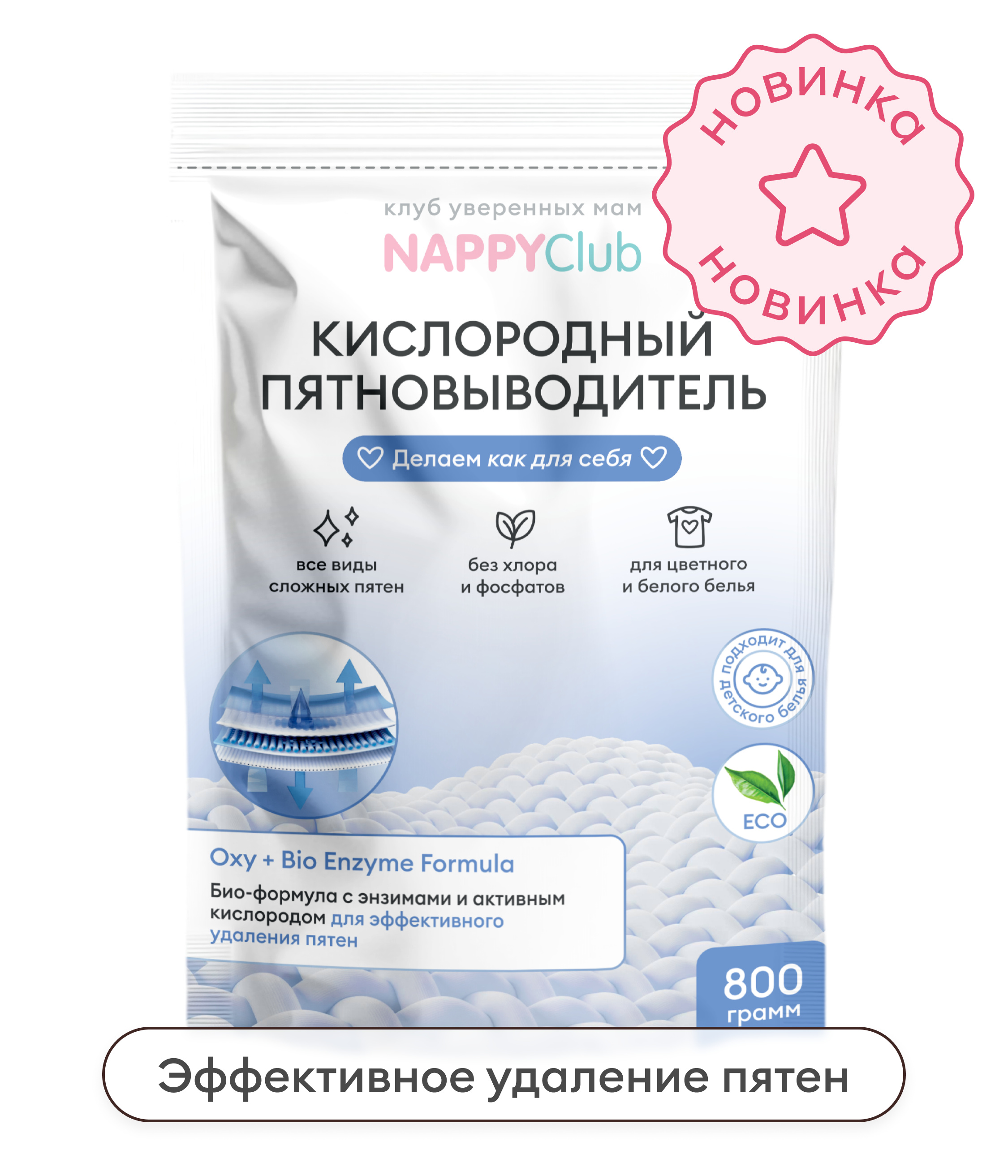 Мощный пятновыводитель от NappyClub 800гр — профессиональное средство на основе активного кислорода, созданное специально для стирки белого и цветного белья. Это бытовая химия без агрессивных компонентов, которая эффективно устраняет сложные и застарелые пятна на тканях, сохраняя яркость и структуру одежды.