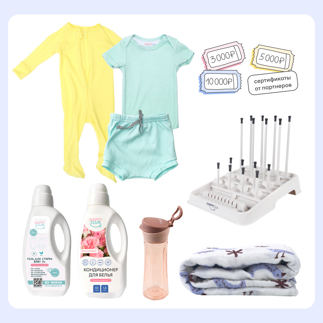 В каждом боксе есть подарки от партнеров NappyClub суммарно номиналами от 15 000 рублей на их услуги и товары.