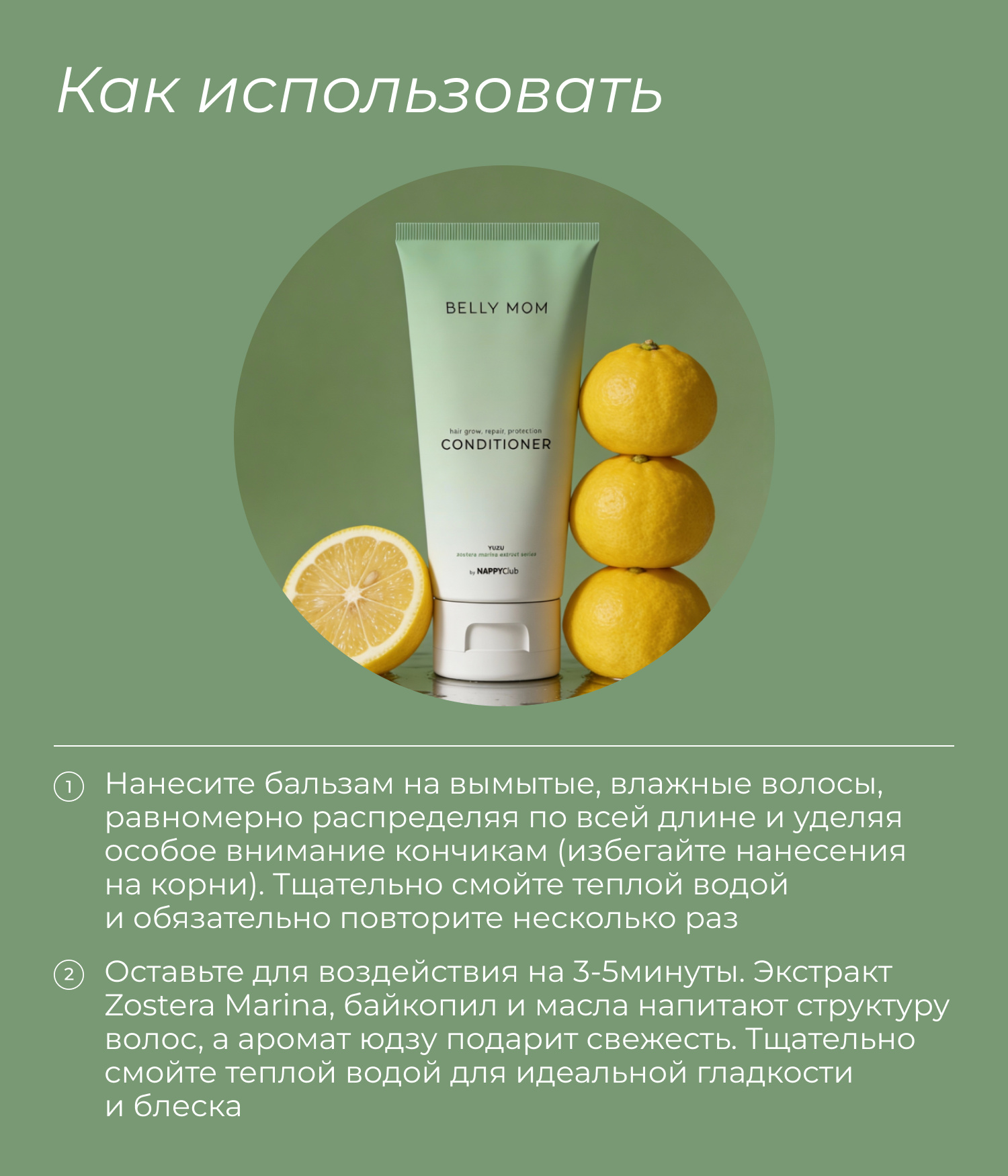 Каждое использование бальзама-кондиционера BELLY MOM превращается в момент истинного наслаждения. Нежный, свежий и бодрящий аромат юдзу (японского цитруса) окутывает вас вуалью спокойствия и гармонии, помогая снять стресс и улучшить настроение.