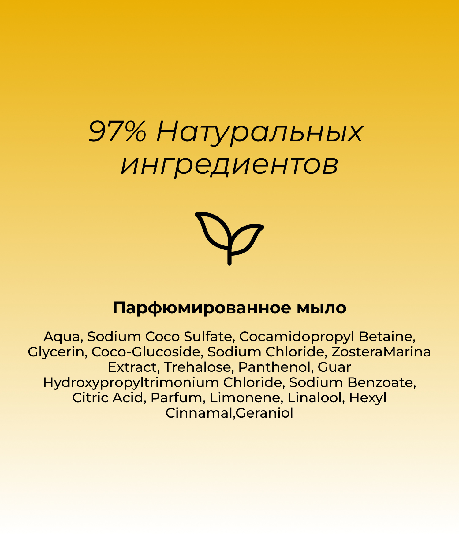 Aqua, Sodium Coco Sulfate, Сocamidopropyl Betaine, Glycerin, Coco-Glucoside, Sodium Chloride, Zostera Marina Extract, Trehalose, Panthenol, Guar Hydroxypropyltrimonium Chloride, Sodium Benzoate, Citric Acid, Parfum, Limonene, Linalool, Hexyl Cinnamal,Geraniol.