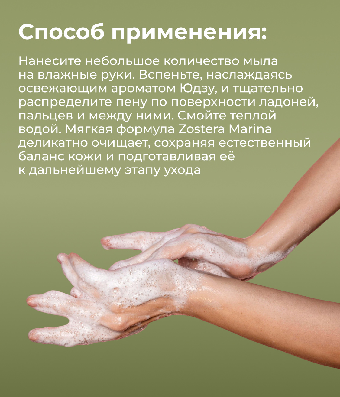 Ключевые компоненты, обеспечивающие исключительный уход: экстракт Zostera Marina (Морская Зостера), мягкие ПАВ (Поверхностно-Активные Вещества), аромат Юдзу (Yuzu)