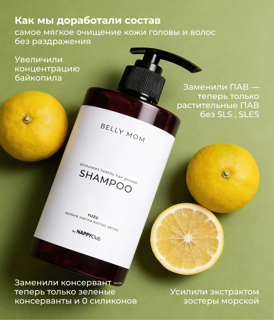 Шампунь BELLY MOM Zostera Marina (Юдзу): Aqua, Sodium Coco Sulfate, Сocamidopropyl Betaine, Coco-Glucoside, Sodium Chloride, Cocamide DEA, Zostera Marina Extract, Propanediol, Arginine, Lactic Acid, Glycine Soja (Soybean ) Germ Extract, Triticum Vulgare (Wheat) Germ Extract, Scutellaria Baicalensis Root Extract, Sodium Benzoate, Gluconolactone, Calcium Gluconate, Niacinamide, Allantoin, Glycerin, Polyquaternium-10, Polyquaternium-7, Tetrasodium EDTA, Citric Acid, Parfum, Limonene, Linalool, Hexyl Cinnamal, Geraniol.