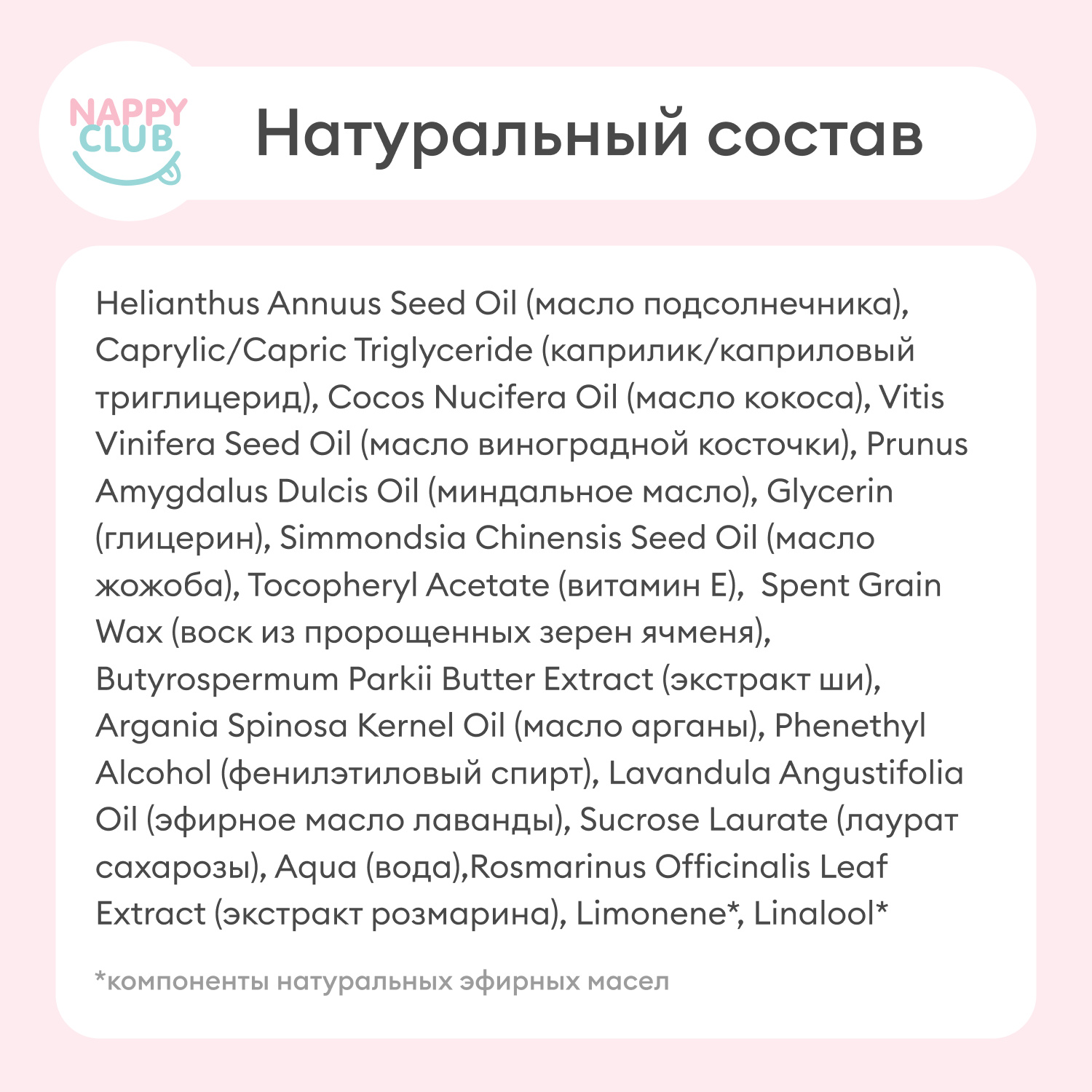 Состав: Helianthus Annuus Seed Oil (масло подсолнечника), Caprylic/Capric Triglyceride (каприлик/каприловый триглицерид), Cocos Nucifera Oil (масло кокоса), Vitis Vinifera Seed Oil (масло виноградной косточки), Prunus Amygdalus Dulcis Oil (миндальное масло), Glycerin (глицерин), Simmondsia Chinensis Seed Oil (масло жожоба), Tocopheryl Acetate (витамин Е), Spent Grain Wax (воск из пророщенных зерен ячменя), Butyrospermum Parkii Butter Extract (экстракт ши), Argania Spinosa Kernel Oil (масло арганы), Phenethyl Alcohol (фенилэтиловый спирт), Lavandula Angustifolia Oil (эфирное масло лаванды), Sucrose Laurate (лаурат сахарозы), Aqua (вода),Rosmarinus Officinalis Leaf Extract (экстракт розмарина), Limonene*, Linalool*.