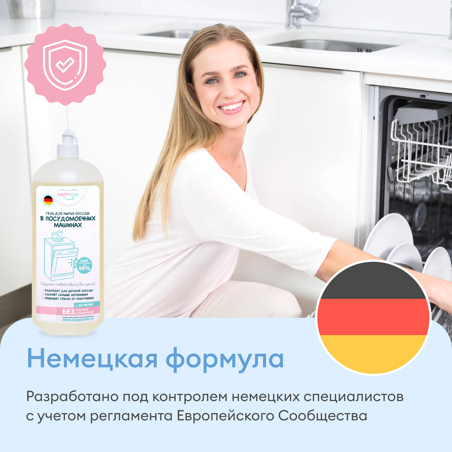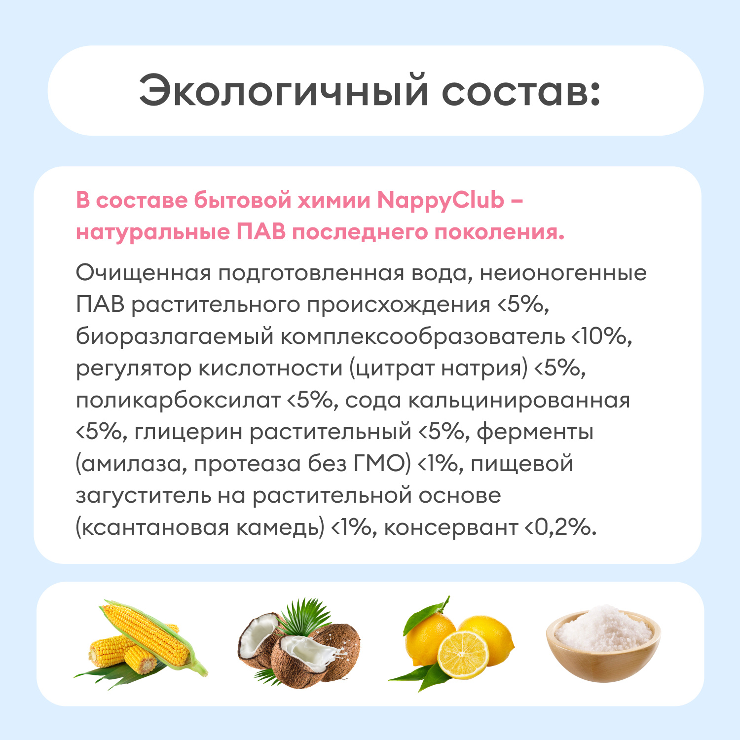 Очищенная подготовленная вода, неионогенные ПАВ растительного происхождения <5%, биоразлагаемый комплексообразователь <10%, регулятор кислотности (цитрат натрия) <5%, поликарбоксилат <5%, сода кальцинированная <5%, глицерин растительный <5%, ферменты (амилаза, протеаза без ГМО) <1%, пищевой загуститель на растительной основе (ксантановая камедь) <1%, консервант <0,2%.