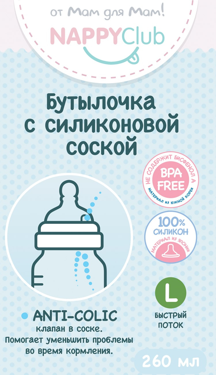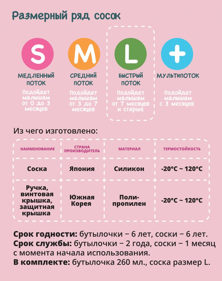 L - быстрый поток. Подойдёт малышам от 7 месяцев, бутылочка 260 мл.