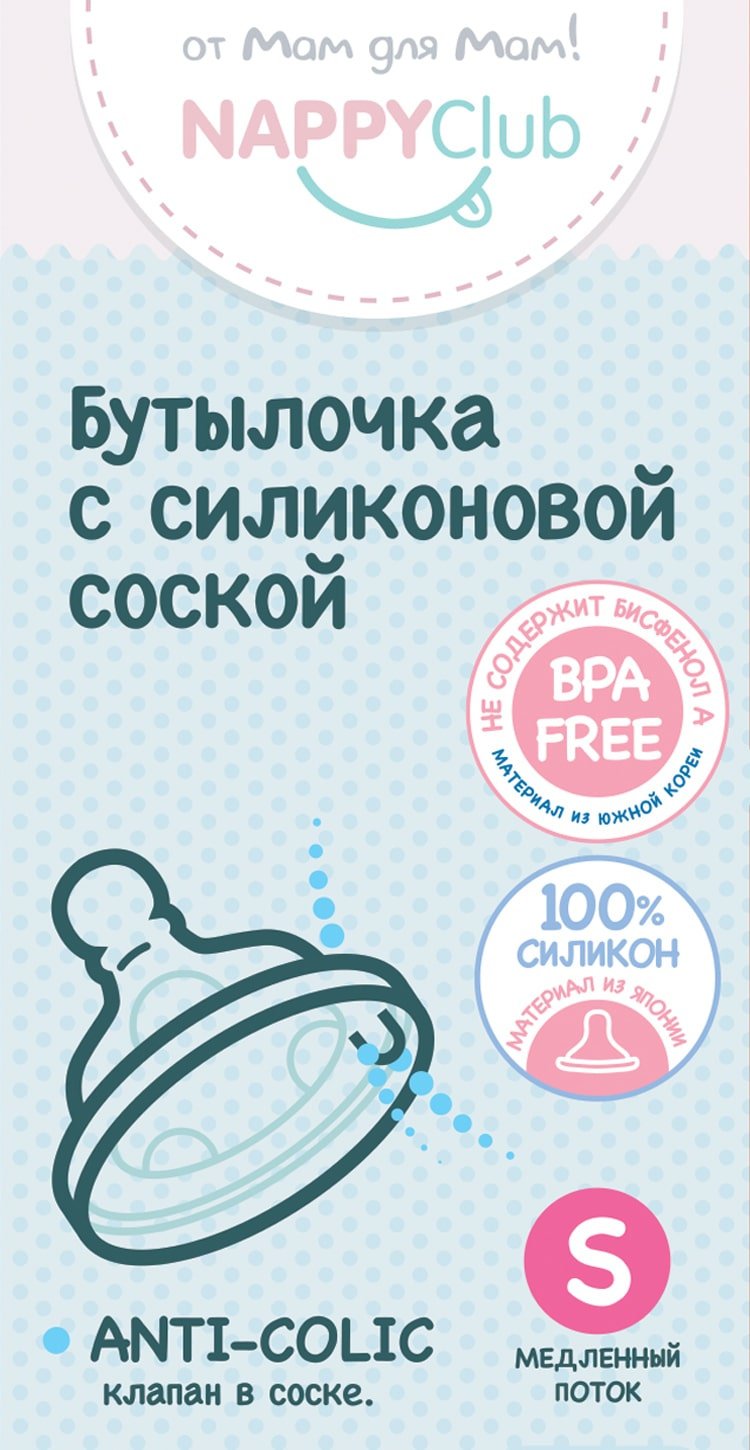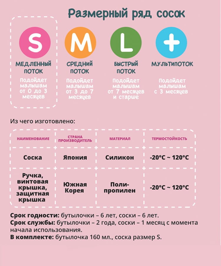 S - медленный поток. Подойдёт малышам от 0 до 3 месяцев, бутылочка 160 мл.
