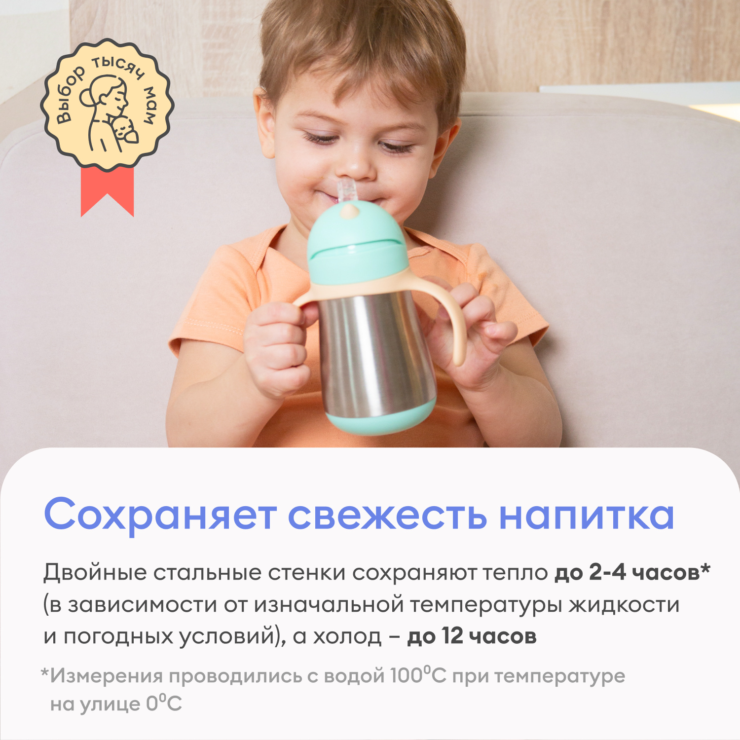 Сохраняет идеальную температуру напитков вашего ребенка. Летом сохранит компот свежим, не смотря на жару. Зимой термопоильник сохранит теплой водичку или чай на протяжении всей прогулки.