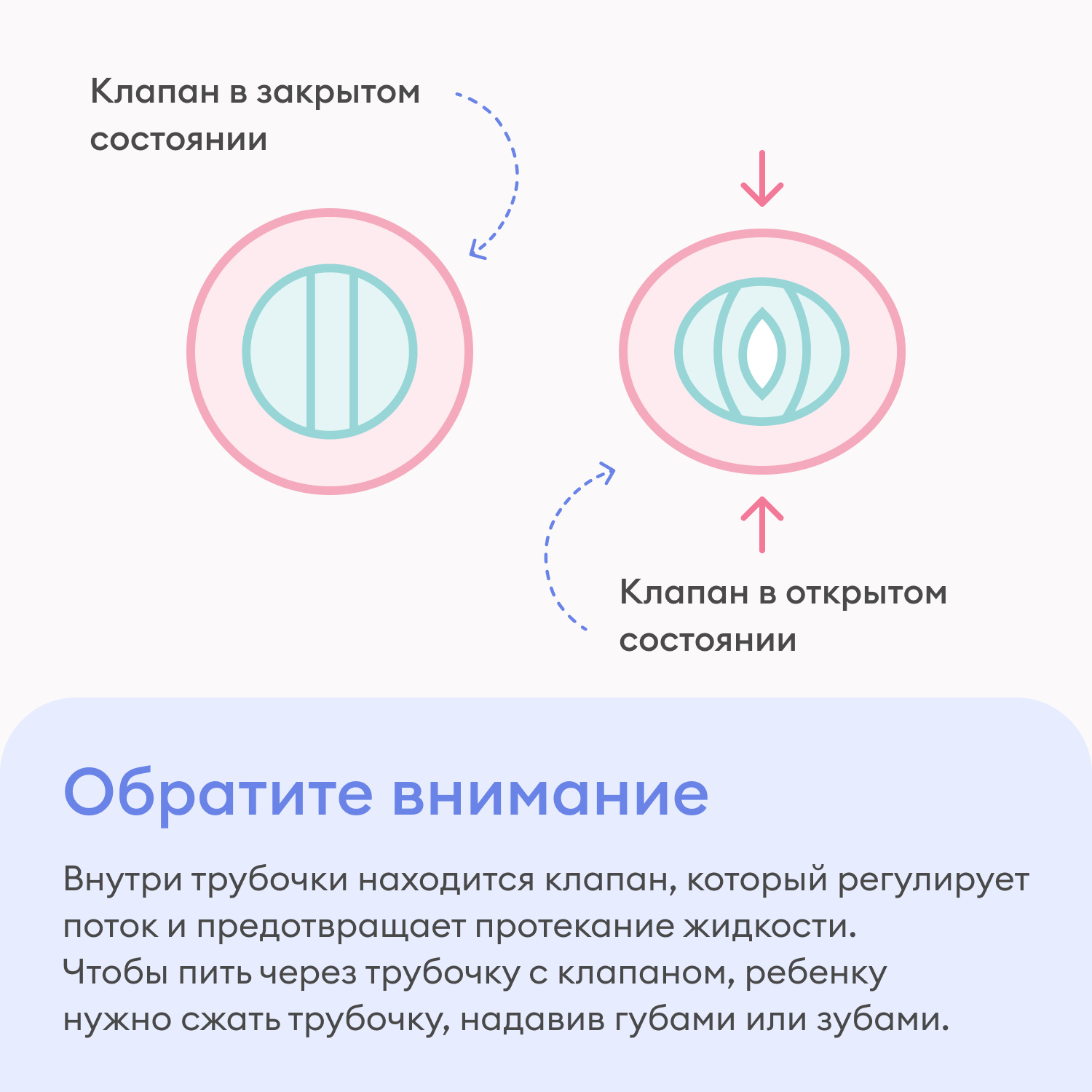 Внутри трубочки находится клапан, который регулирует поток и предотвращает протекание жидкости. Чтобы пить через трубочку с клапаном, ребенку нужно немного сжать трубочку, надавив губами или зубами.