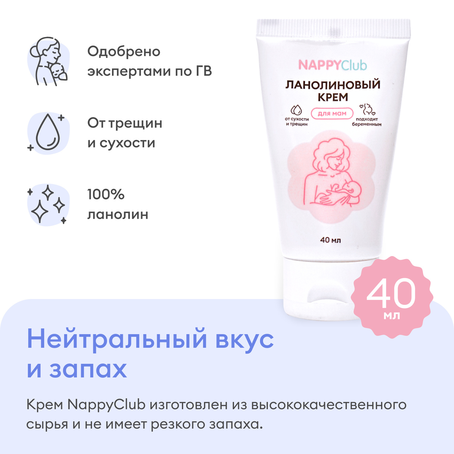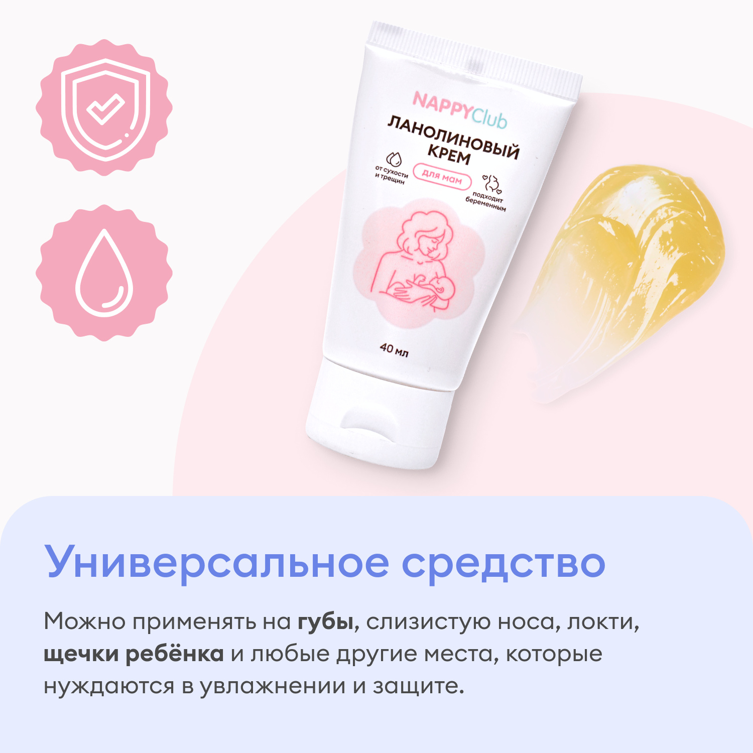 Ланолиновый крем для ежедневного ухода за кожей груди, сосков, губ, локтей, слизистой носа, детских щек и других частей тела, которые нуждаются в дополнительном увлажнении и защите.