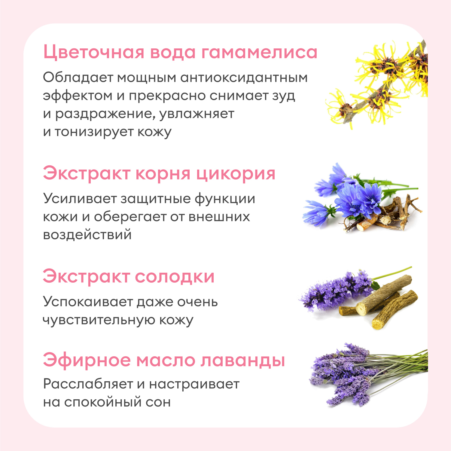 Активные ингредиенты: цветочная вода гамамелиса, экстракты солодки и корня цикория, эфирное масло лаванды