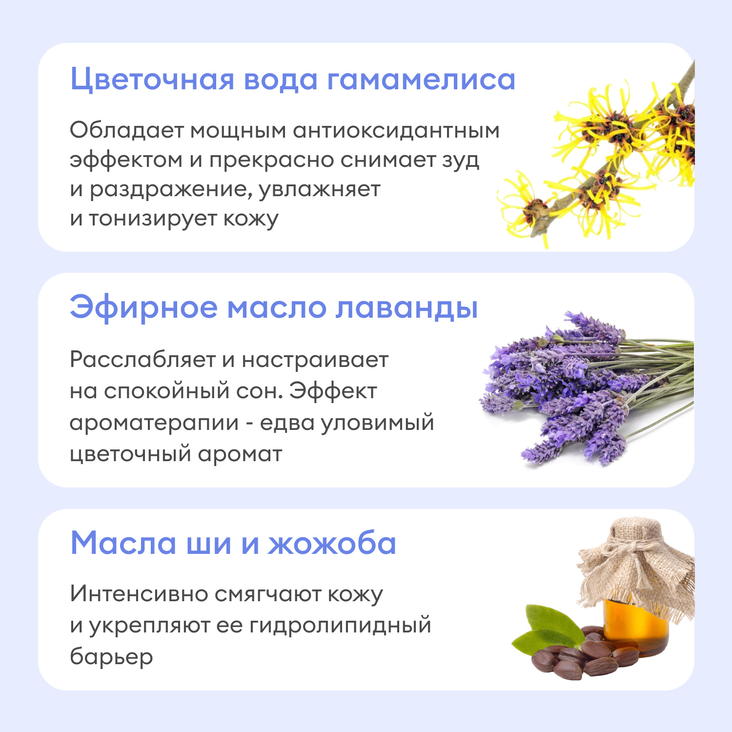 Активные ингредиенты: цветочная вода гамамелиса, масло ши и жожоба, каолин, цинк, эфирное масло лаванды