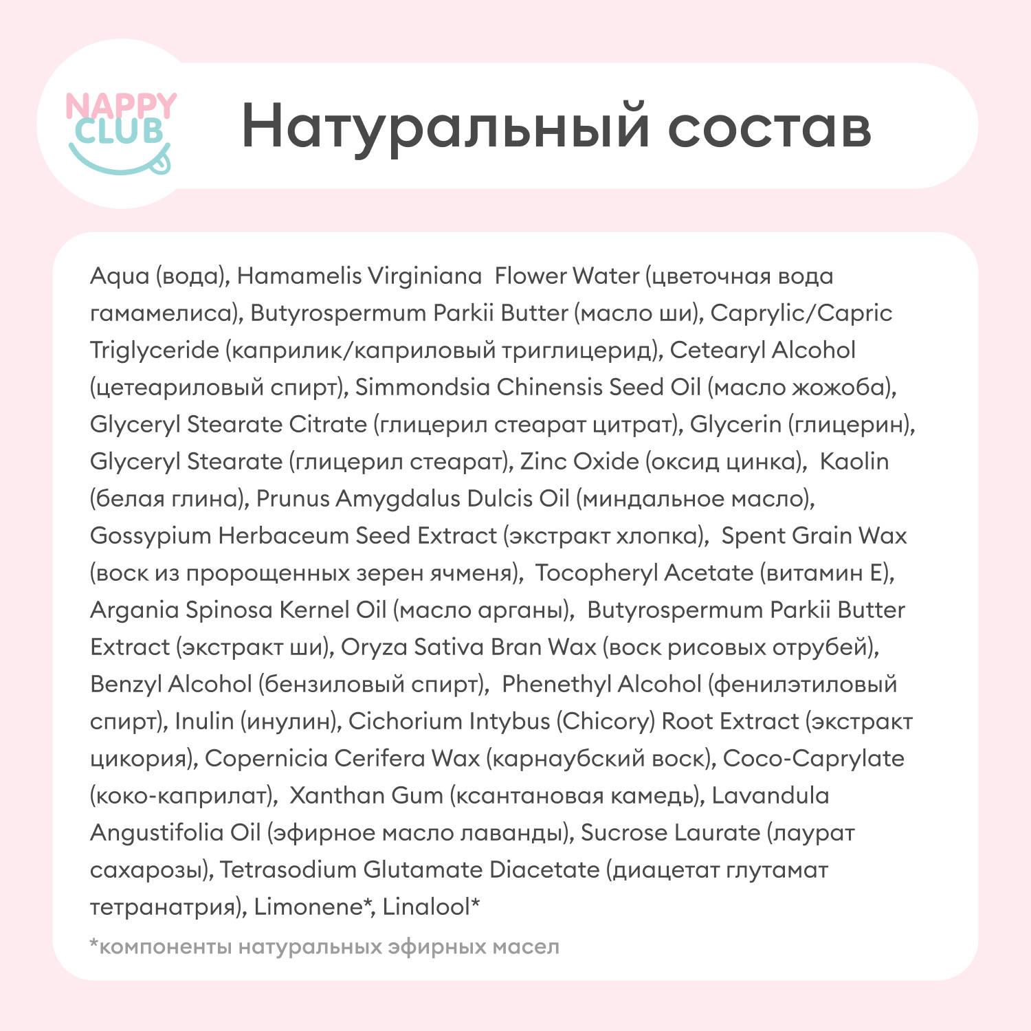Состав: Aqua (вода), Hamamelis Virginiana Flower Water (цветочная вода гамамелиса), Butyrospermum Parkii Butter (масло ши), Caprylic/Capric Triglyceride (каприлик/каприловый триглицерид), Cetearyl Alcohol (цетеариловый спирт), Simmondsia Chinensis Seed Oil (масло жожоба), Glyceryl Stearate Citrate (глицерил стеарат цитрат), Glycerin (глицерин), Glyceryl Stearate (глицерил стеарат), Zinc Oxide (оксид цинка), Kaolin (белая глина), Prunus Amygdalus Dulcis Oil (миндальное масло), Gossypium Herbaceum Seed Extract (экстракт хлопка), Spent Grain Wax (воск из пророщенных зерен ячменя), Tocopheryl Acetate (витамин Е), Argania Spinosa Kernel Oil (масло арганы), Butyrospermum Parkii Butter Extract (экстракт ши), Oryza Sativa Bran Wax (воск рисовых отрубей), Benzyl Alcohol (бензиловый спирт), Phenethyl Alcohol (фенилэтиловый спирт), Inulin (инулин), Cichorium Intybus (Chicory) Root Extract (экстракт цикория), Copernicia Cerifera Wax (карнаубский воск), Coco-Caprylate (коко-каприлат), Xanthan Gum (ксантановая камедь), Lavandula Angustifolia Oil (эфирное масло лаванды), Sucrose Laurate (лаурат сахарозы), Tetrasodium Glutamate Diacetate (диацетат глутамат тетранатрия), Limonene*, Linalool*.